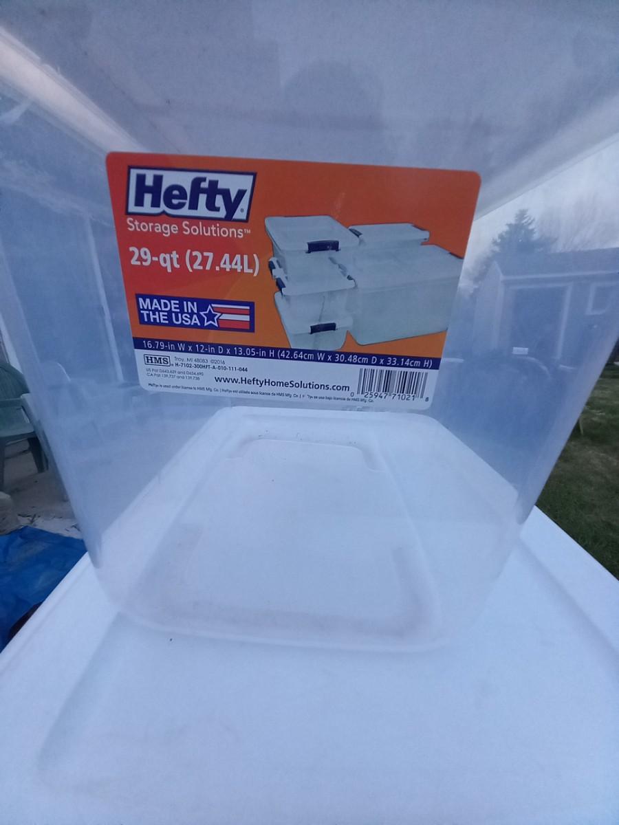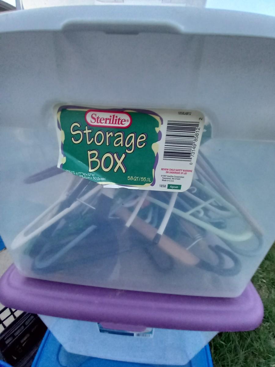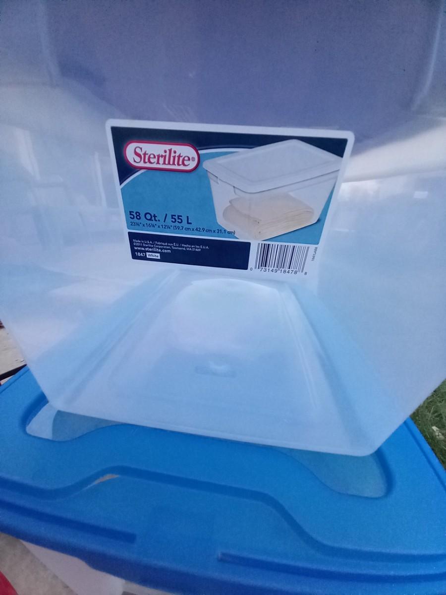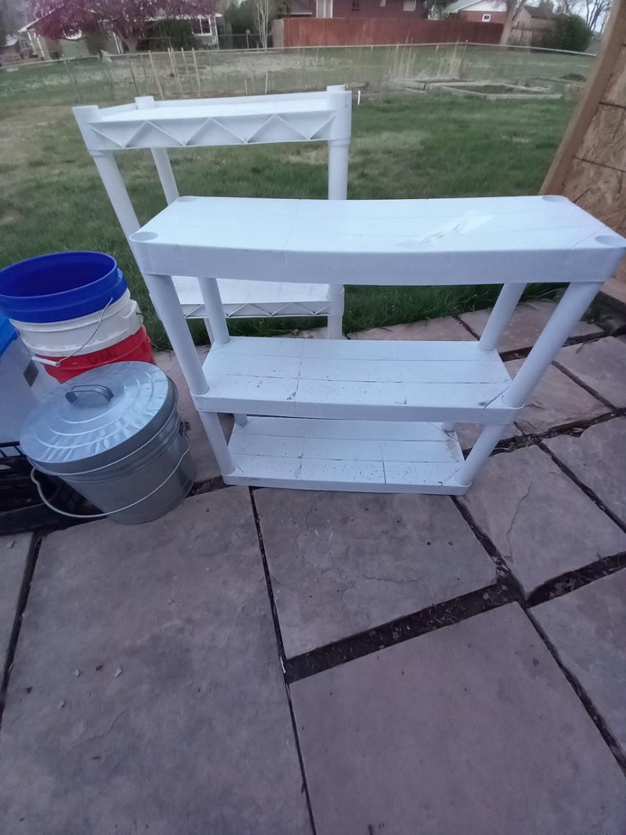 STORAGE CONTAINERS, PLASTIC SHELVES, GALVANIZED TRASH CAN AND 5 GALLON BUCKETS