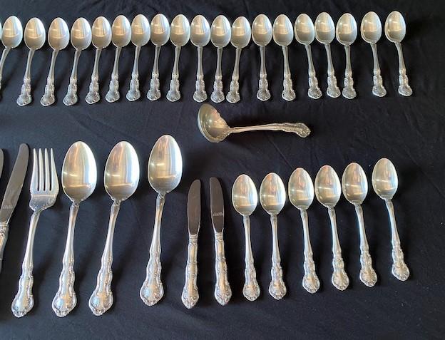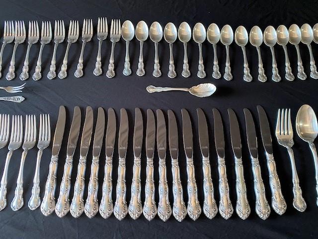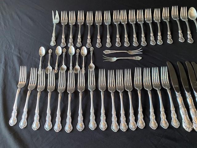 Includes: salad forks, dinner forks, teaspoons, knives, serving pieces. Stainless knife blades removed from weight. Estimated weight of lot: 10lbs. Measurement: 13" x 8"D x 3"H