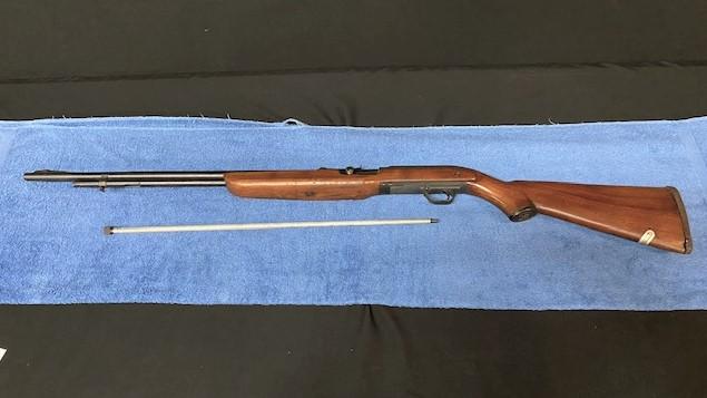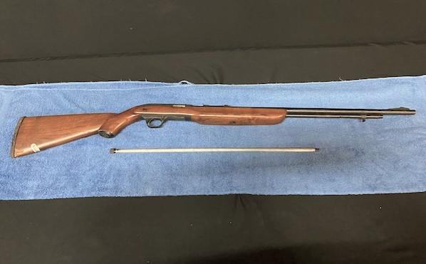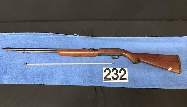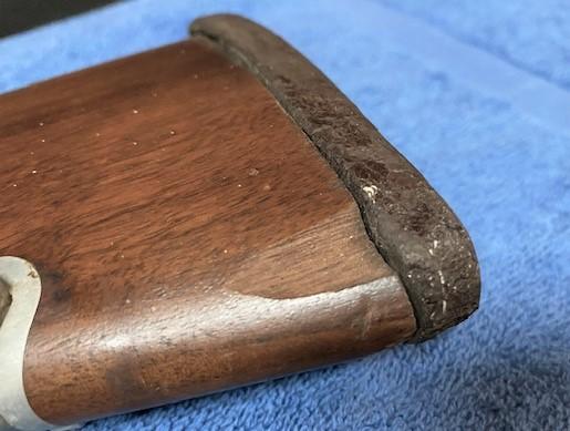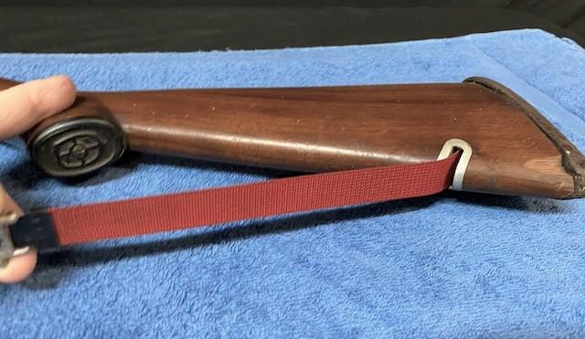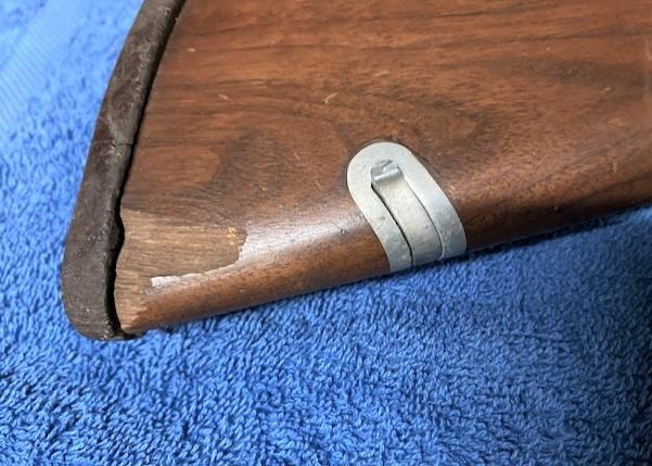 With retractable shoulder sling. Buttstock missing a piece wood.