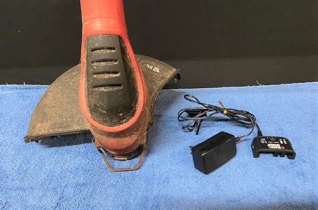 Powered on at time of cataloging. 12" cutting radius. Comes with a battery & charger. Deck needs to be cleaned. Estimated weight of lot: 8lbs. Measurement: 46"L x 10"W