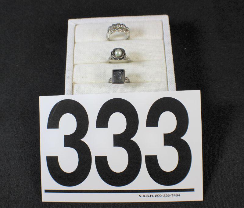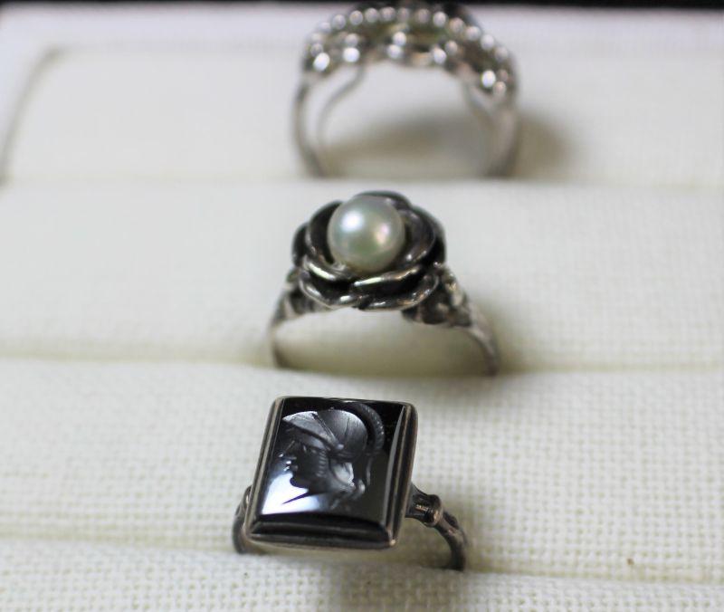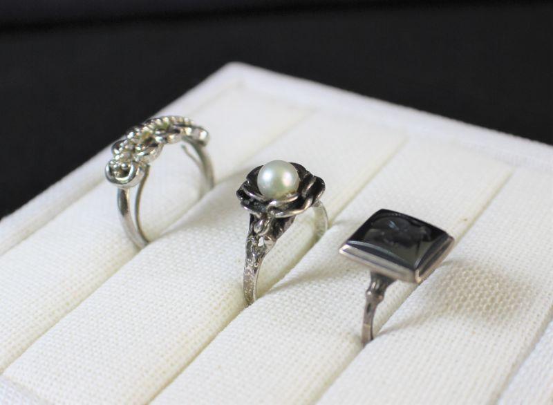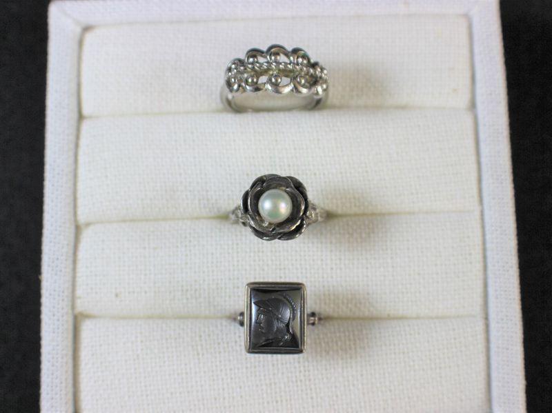 2 silver rings and one Avon. Largest ring size is 9.5.