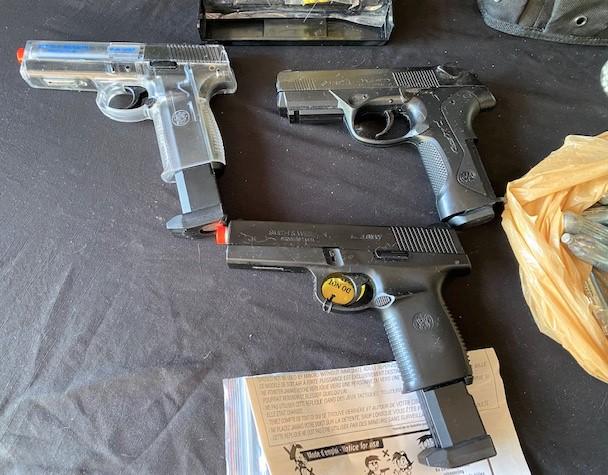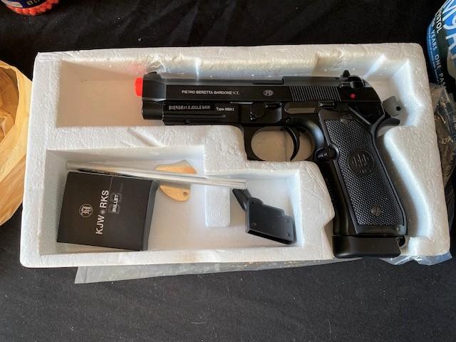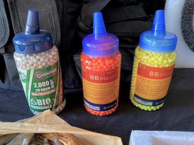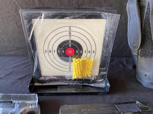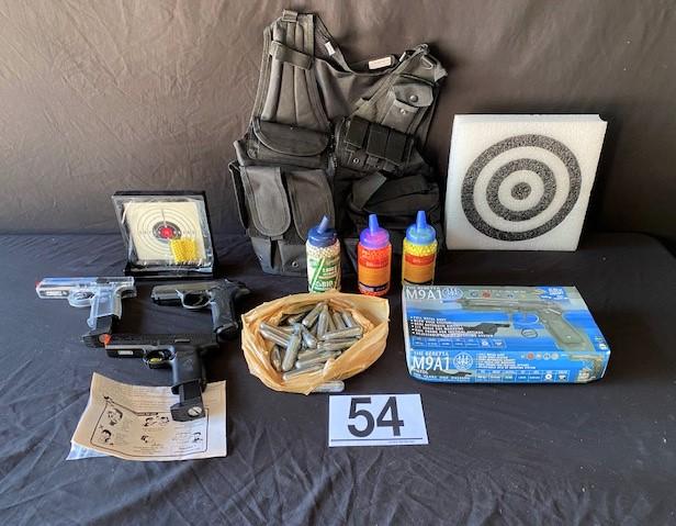 Includes: 2 targets, CO2 cartilages, 4 airsoft pistols, vest, pellets. One airsoft pistol are NOS.