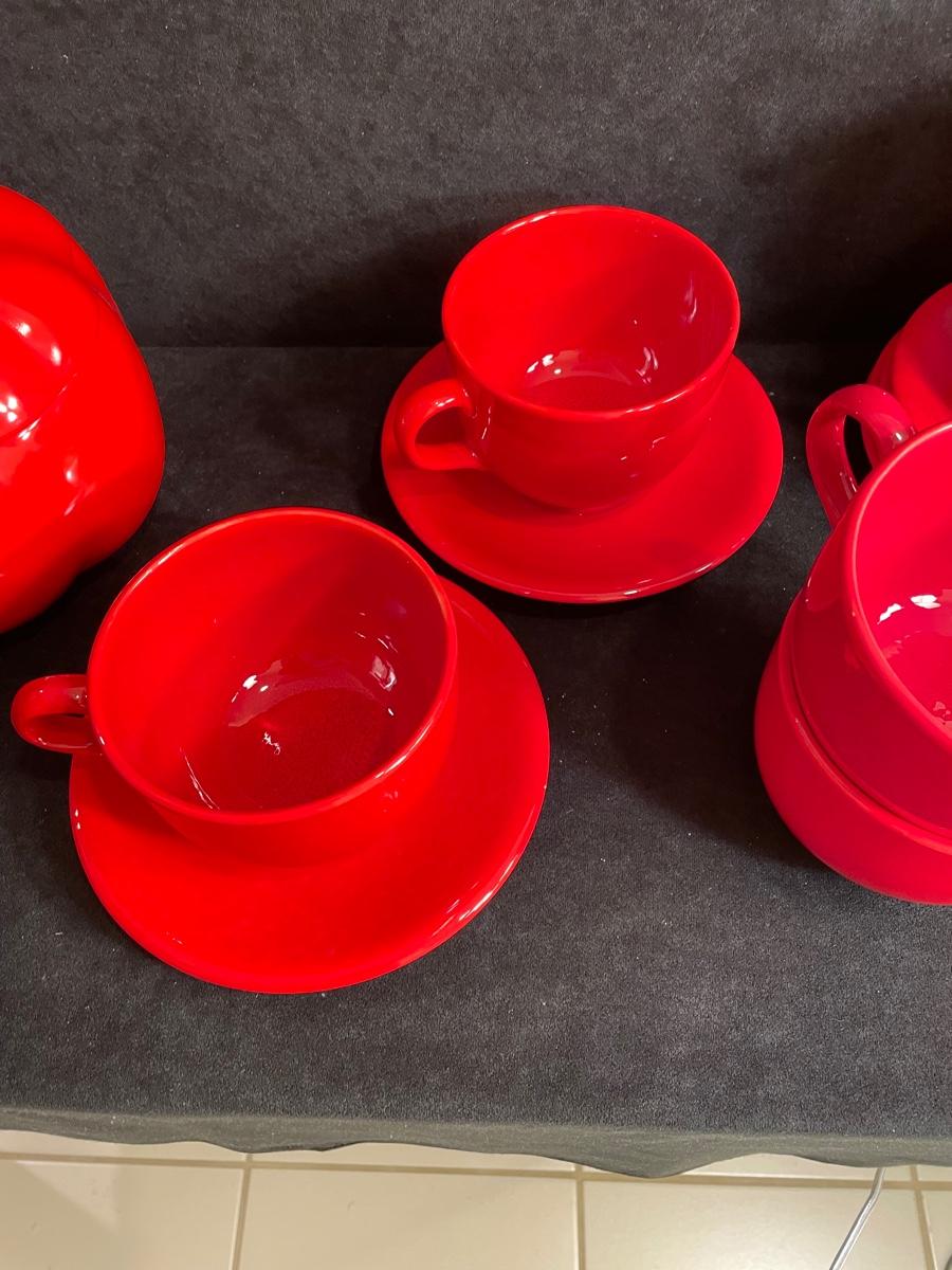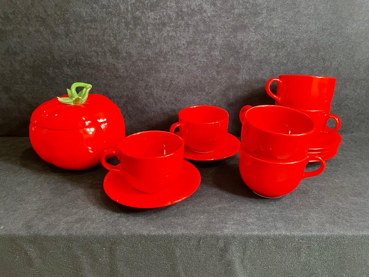 Large ceramic tomato cookie jar and a set of four red ceramic soup bowls with matching lunch plates