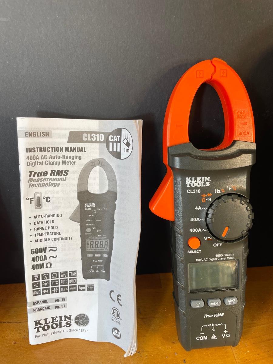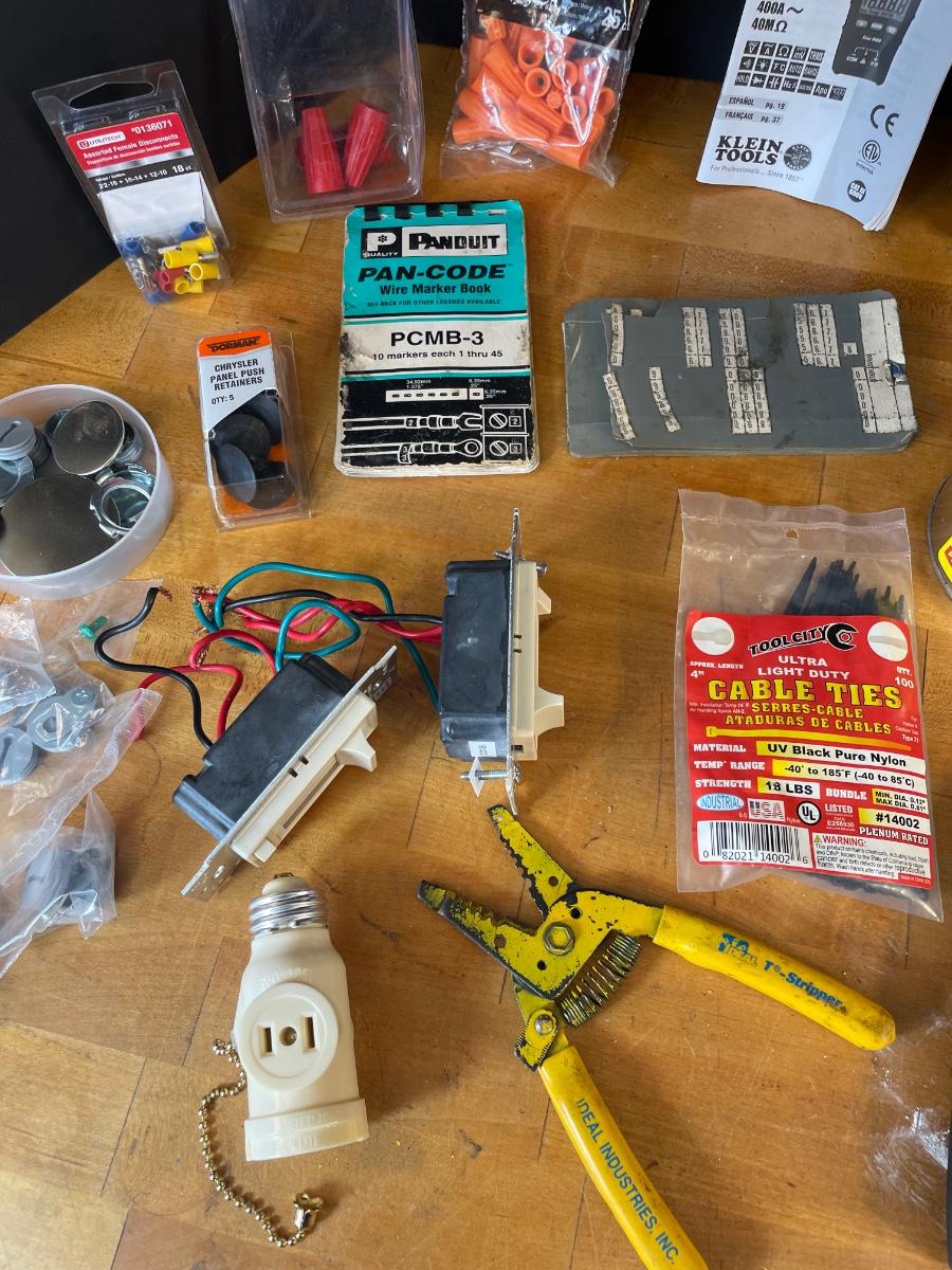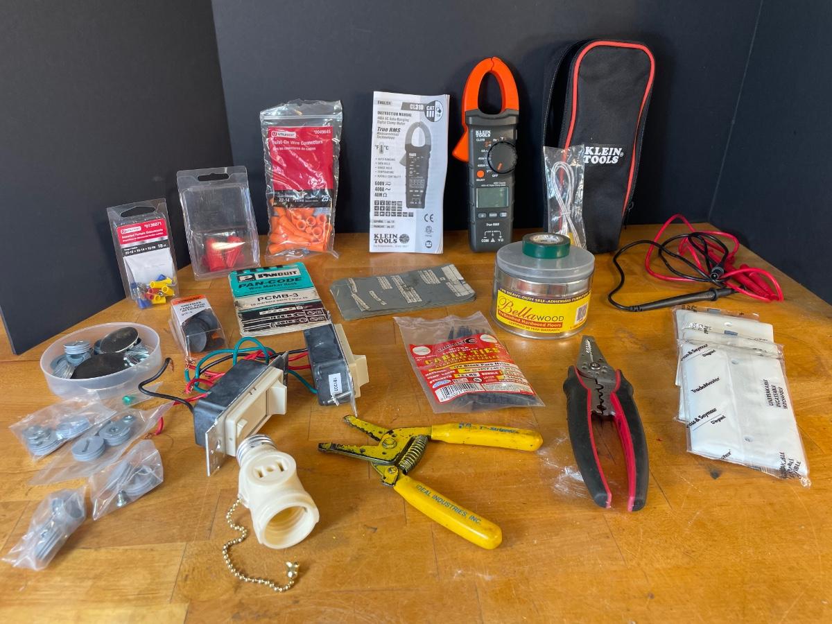 Klein Tools 400 AC digital clamp meter, assortment of electrical supplies and tools including wire-strippers, wire nuts, light switches and hardware