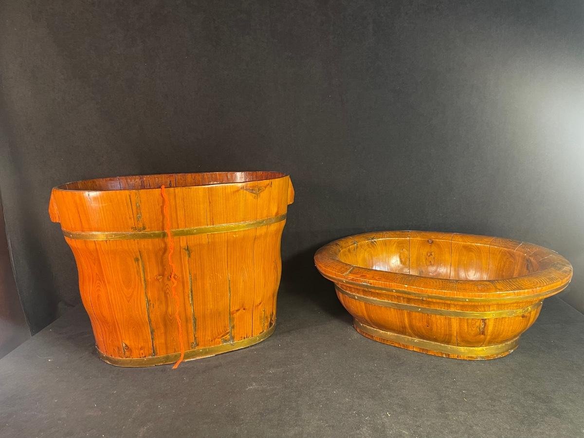 Two-piece wood and brass barrel and tray set, used for storing a knitting project.