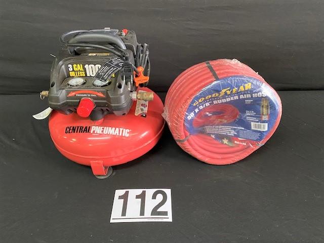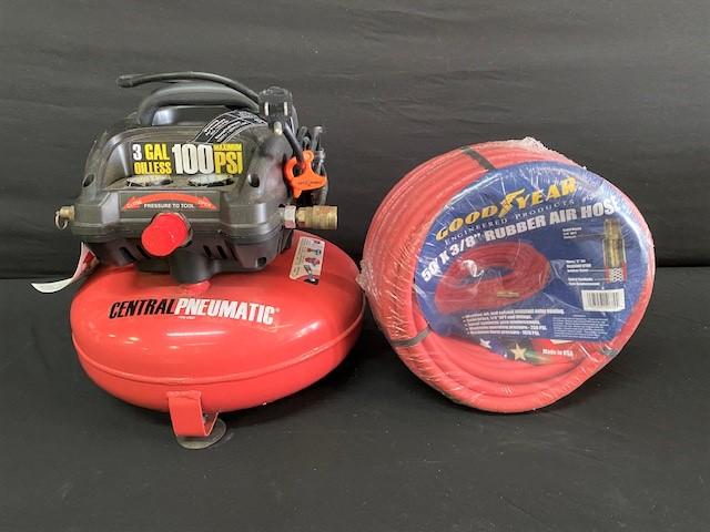 100 psi max. 50ft GoodYear Rubber air hose included. Estimated weight of lot: 10lbs. Measurement: 17" x 15" (compressor)