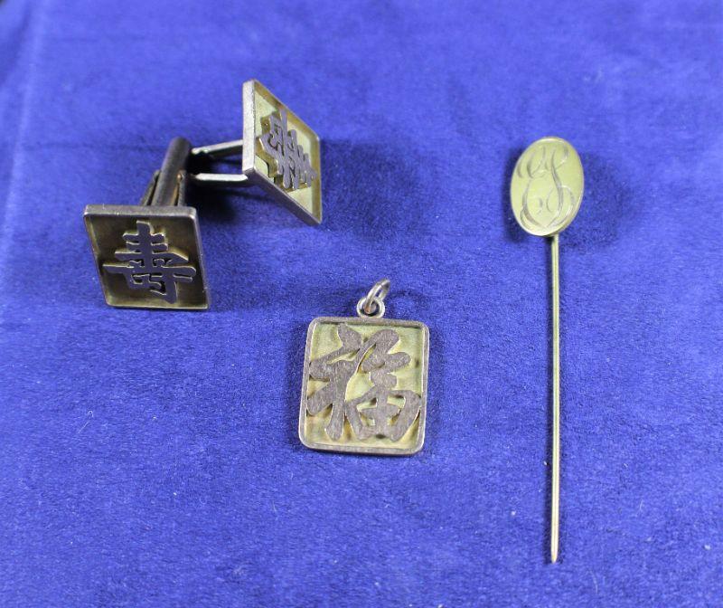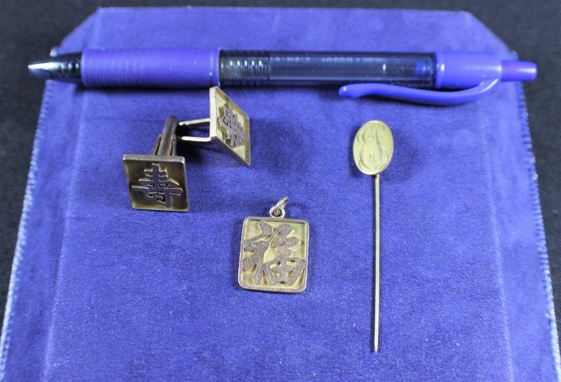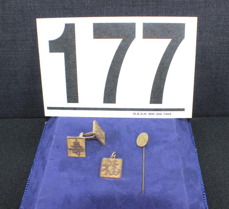 Includes: stick pin, cuff links & charm. One of the cufflinks needs repair.