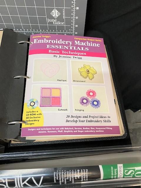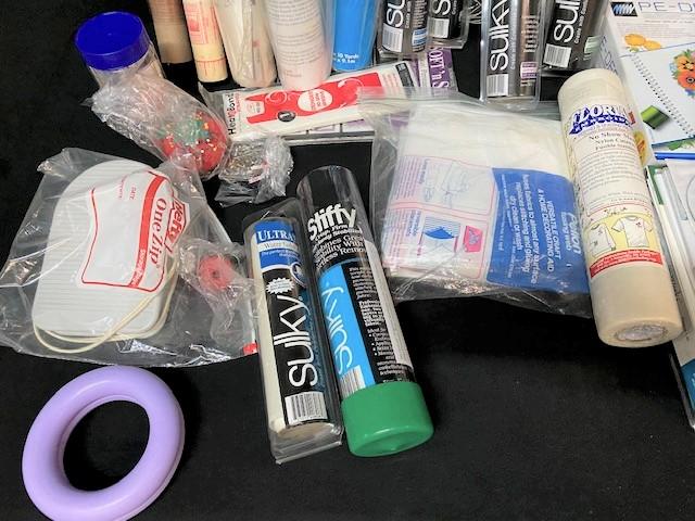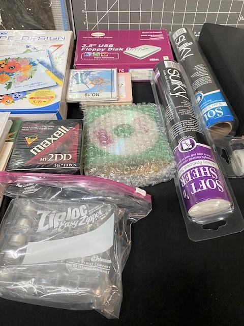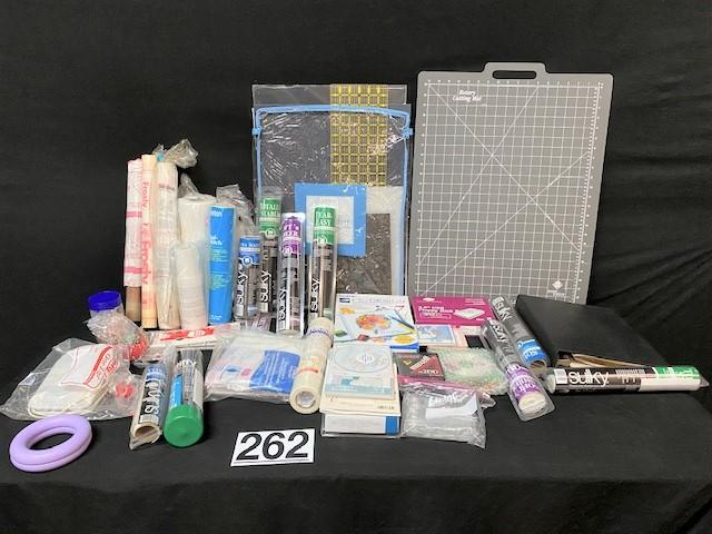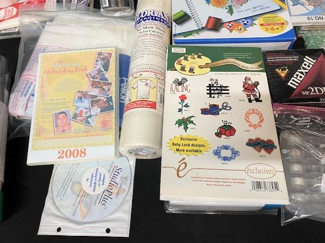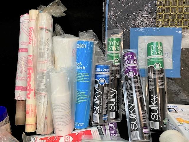 Includes, Sulky stabilizer rolls, cutting mats, machine embroidery patterns (Anita Goodesign) & more. Estimated weight of lot: 15lbs. Measurement: 26 1/2"L x 19 1/2"W (largest cutting mat)
