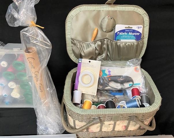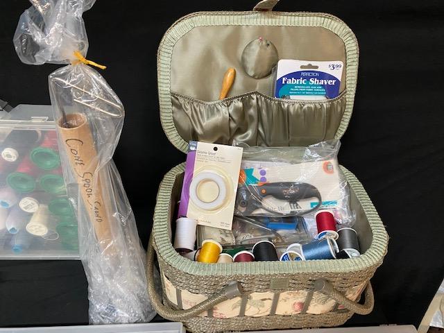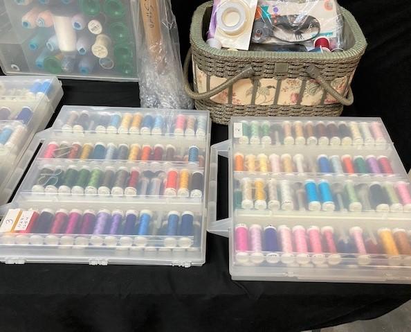 Sulky cases are double-sided. Assorted sewing/machine embroidery threads & large spool stand. Estimated weight of lot: 15lbs. Measurement: 14"L x 10"W x 8"H (sewing basket)