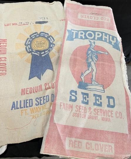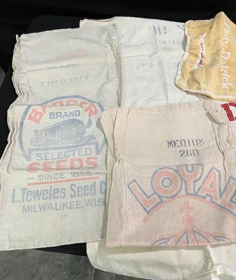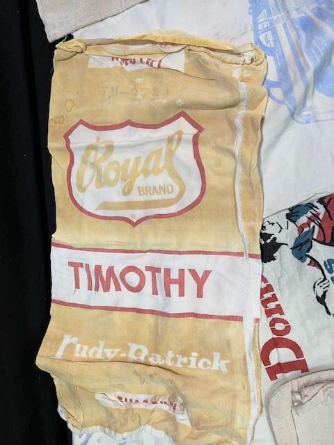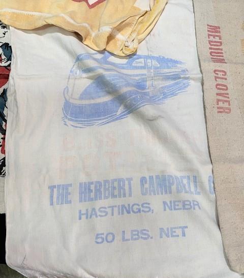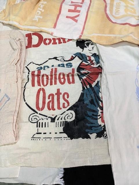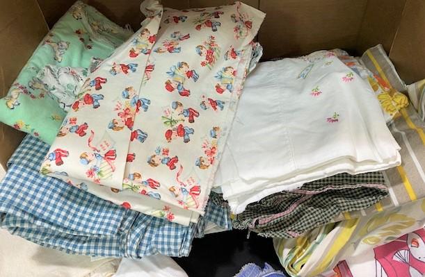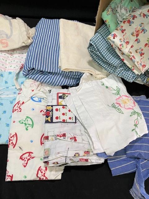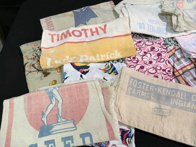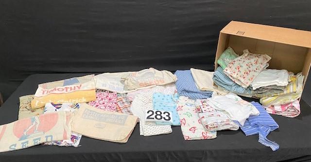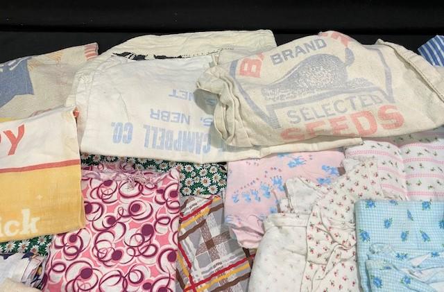 Feed sacks, fish pattern, flower pattern & more. Estimated weight of lot: 20lbs. Measurement: 19" x 15" x 12" (largest item)