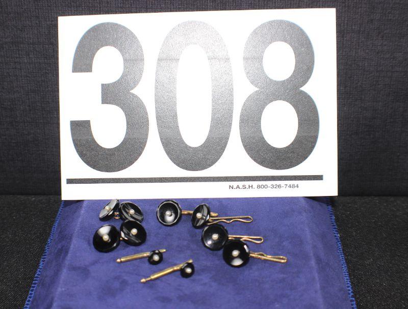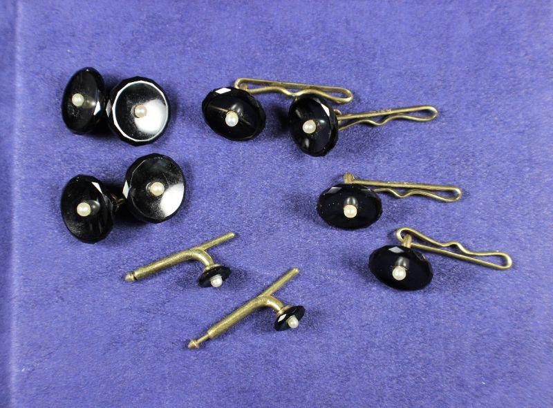 Includes: cufflinks & buttons. Construction appears to be gold, black plastic & faux pearls.