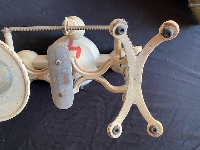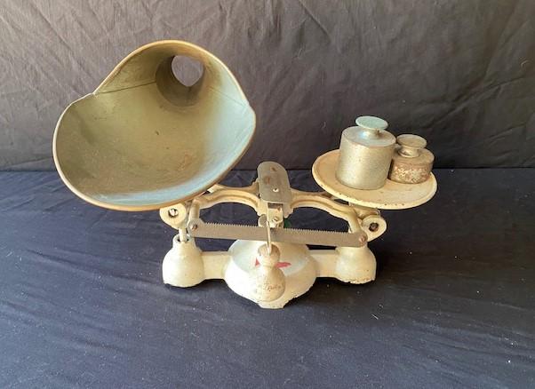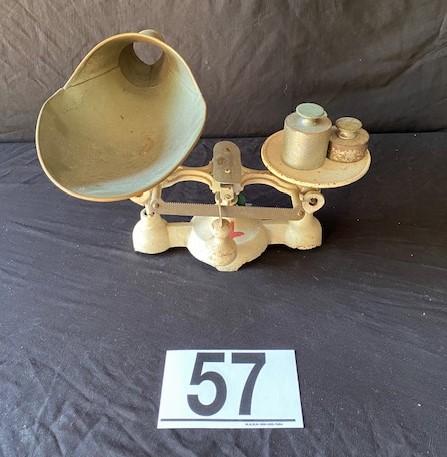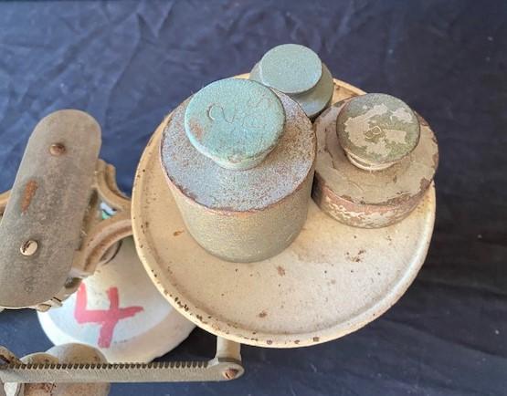 Appears to be working. Includes: 3 counterweights & a copper scoop. Estimated weight of lot: 20lbs. Measurement: 15"L x 11"H x 14"D (scale with everything)