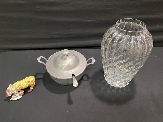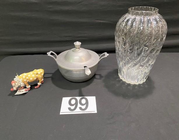 Pewter terrine, cow parade, large blown glass vase. Measurement: 13"H x 9" x 8"