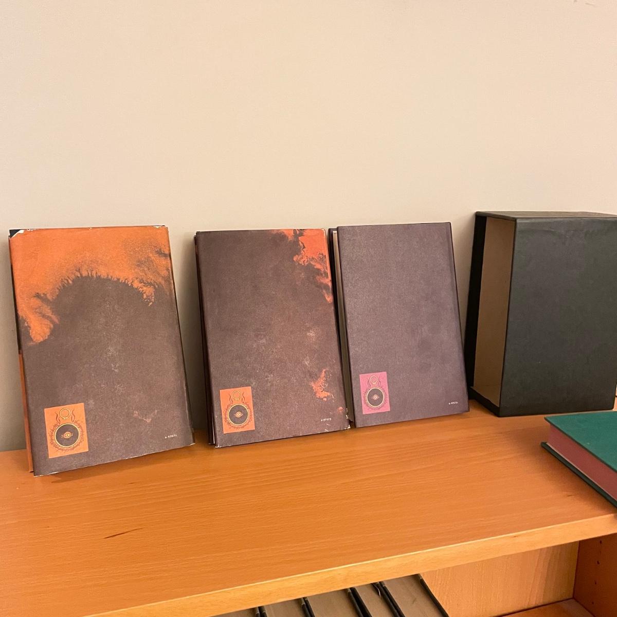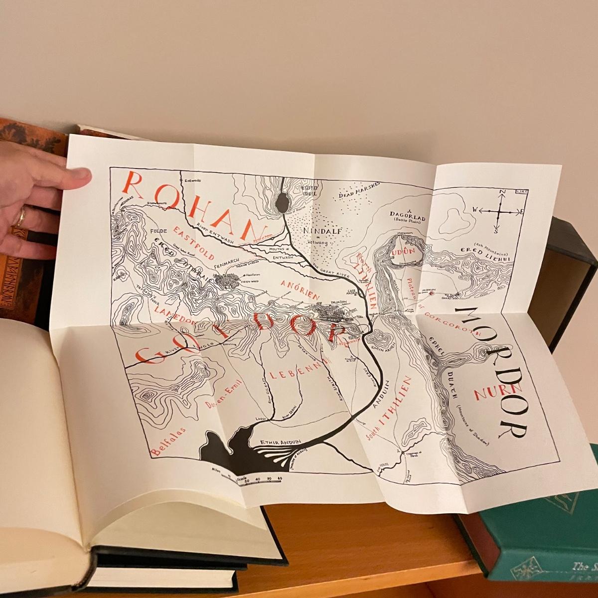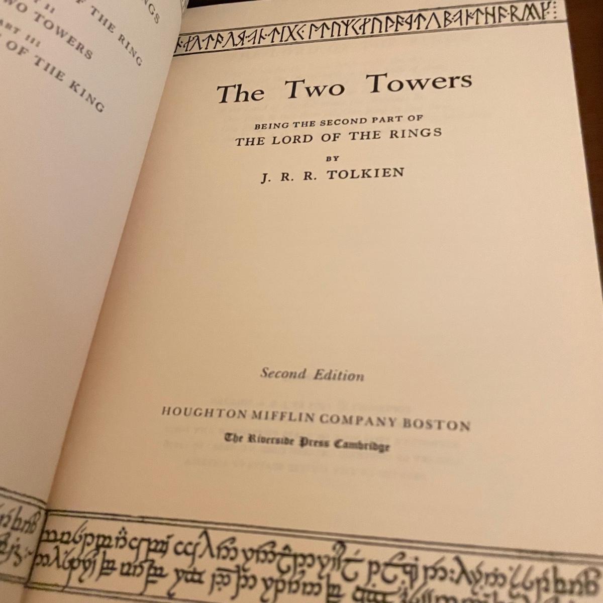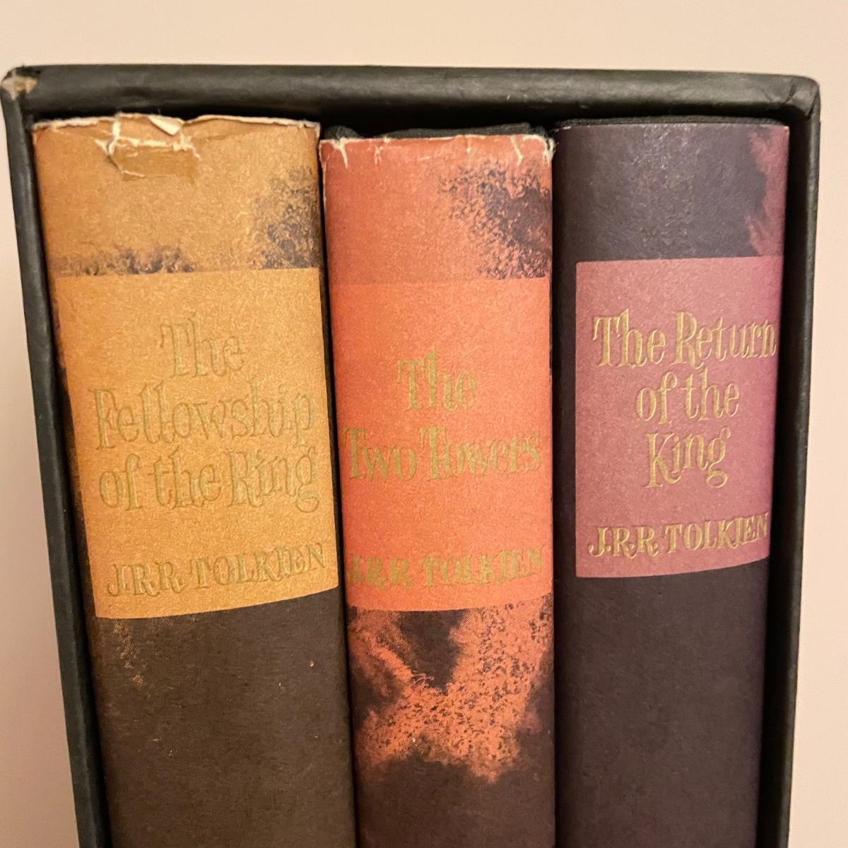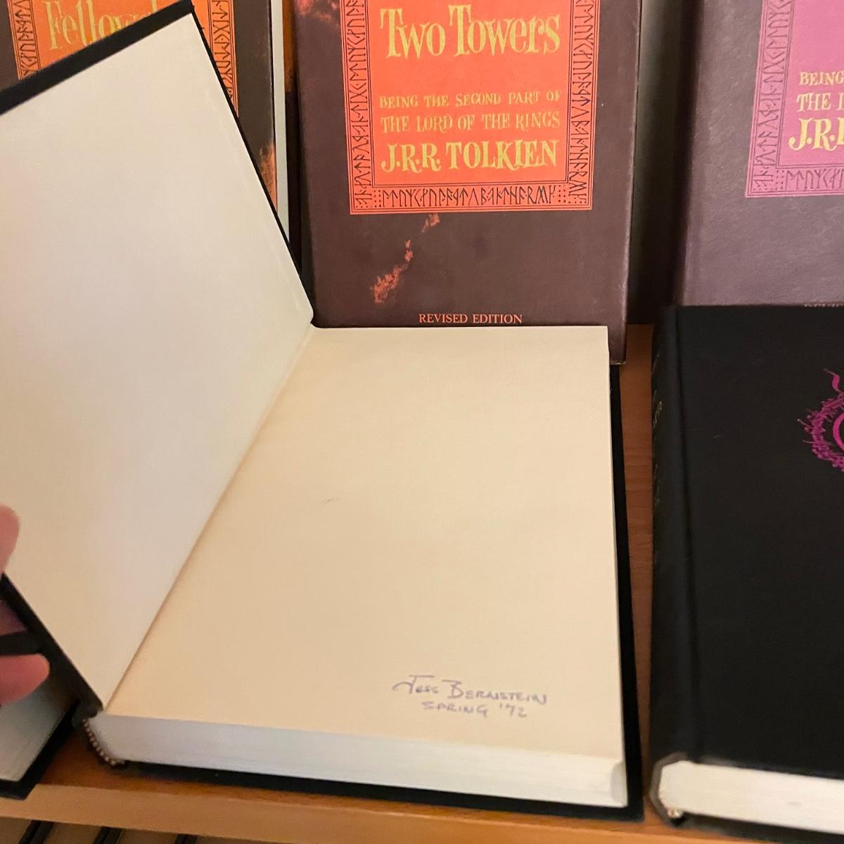 JRR Tolkien’s 1st American Edition hardcover The Silmarillion and a 4th printing of the trilogy The Lord of the Rings. The LOTR books have their dust jackets, the hardcovers under them are in stunning condition, complete with Middle Earth maps in all three. Of the three, The Two Towers has a name written on the 1st page, the other LOTR books do not have known markings inside.