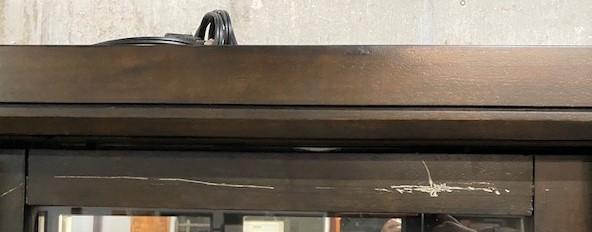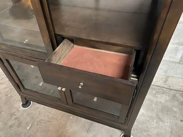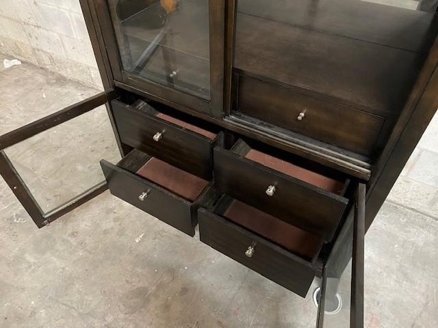 1 glass shelf & 6 lined drawers. Sliding pocket doors. Some scratches. Measurements: 72"H x 44"W x 18 1/2"D