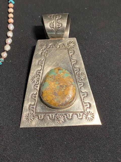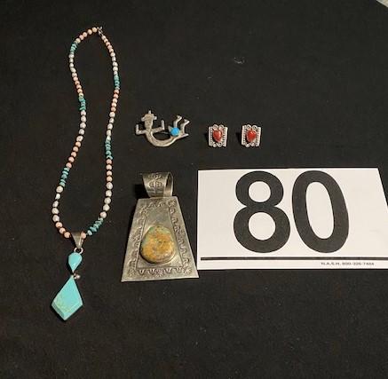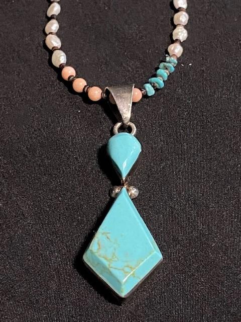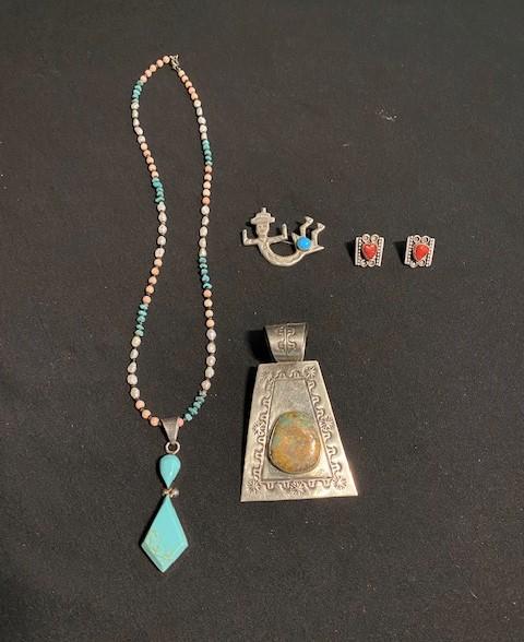 Lot includes: 2 pendants, 1 pin, earrings & necklace with freshwater pearls, turquoise and pink coral. Necklace 22"long. Estimated weight of lot: 1lbs. Measurement: 4" x 4" x 4"