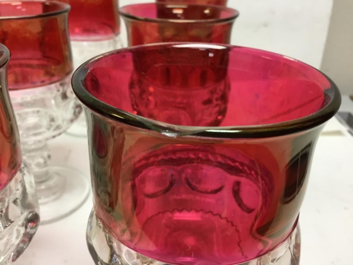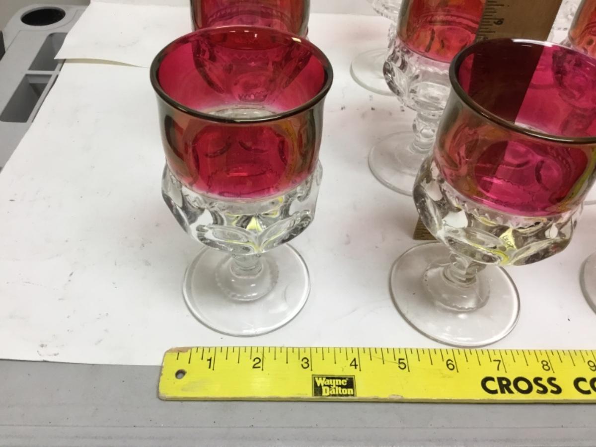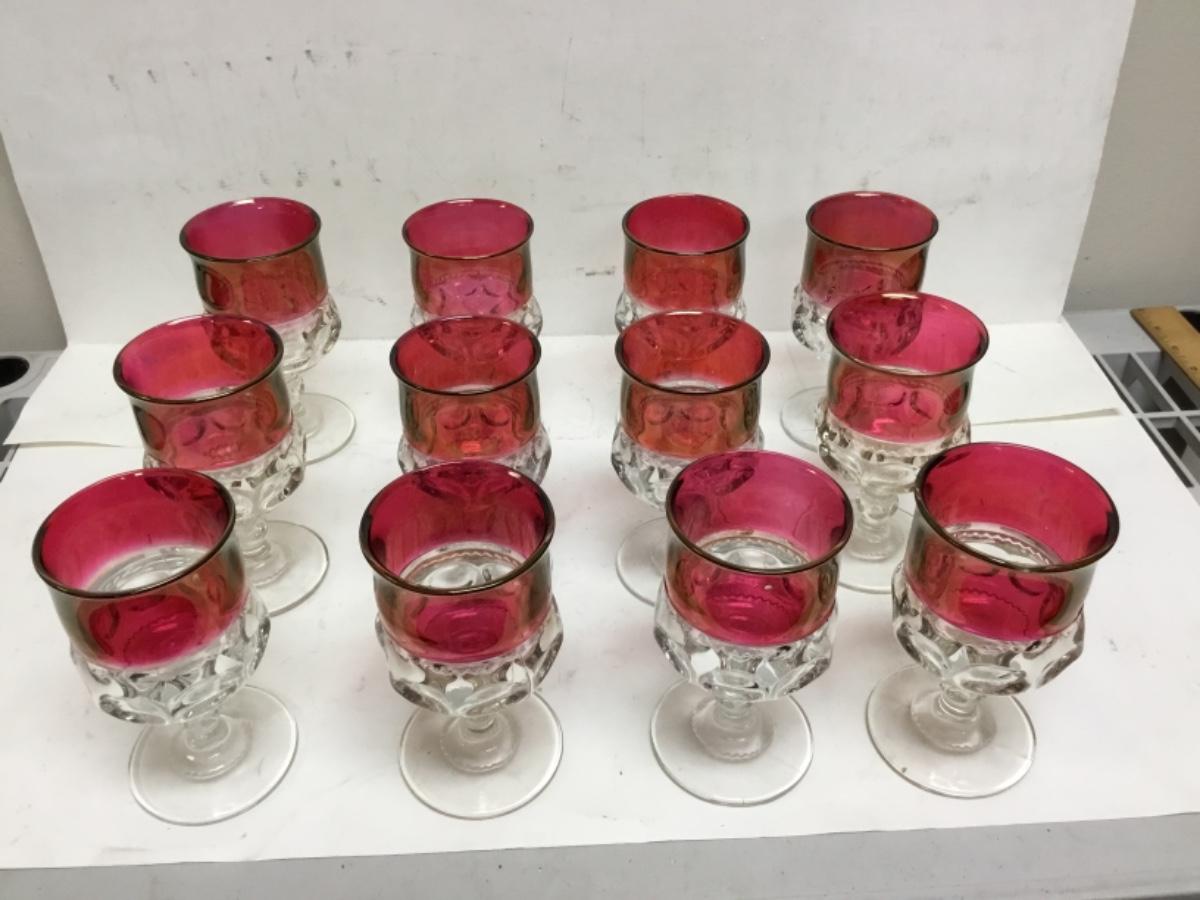 Set of 12 Kings Crown thumbprint goblet glasses. Cranberry red and clear. Did notice a minor chip along the edge of one and some light scratching.