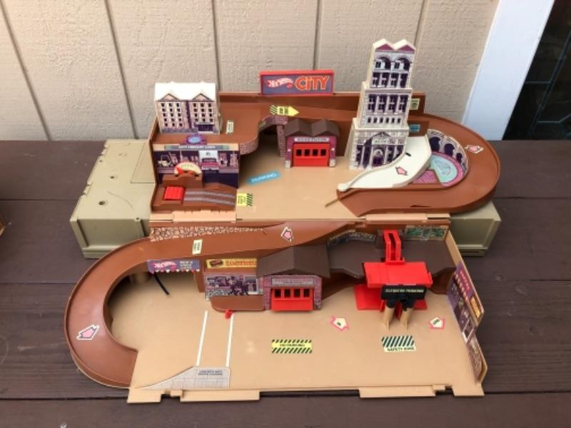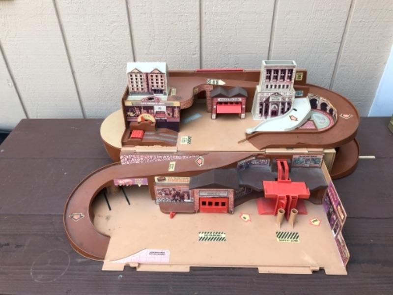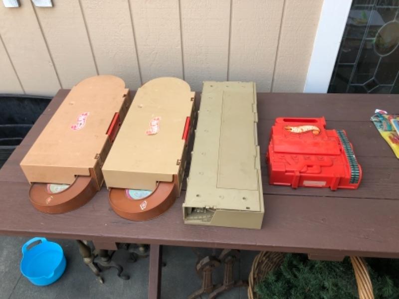 Lots 128, 253, 254, 255: Hot Wheels Plastic Car Holder, Engine Shape; Hot Wheels Transportation Depot: Light Tan; 2 Hot Wheels Car Track: Light Brown. 1980’s