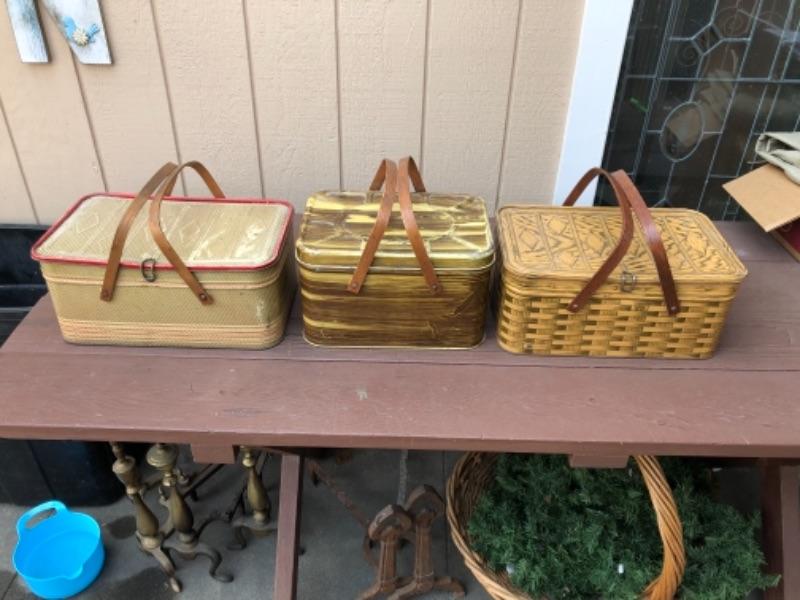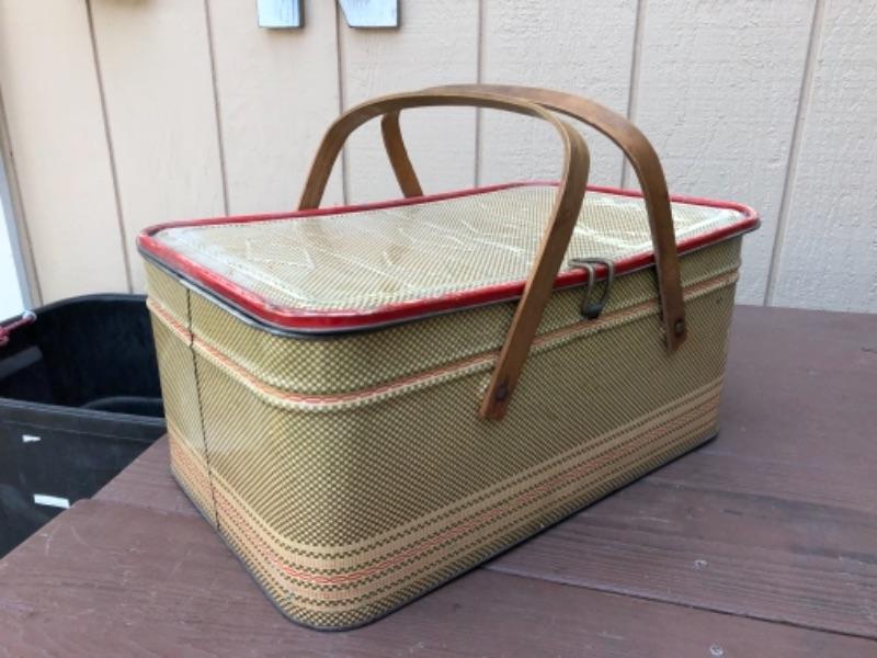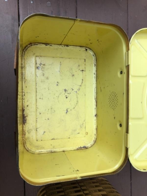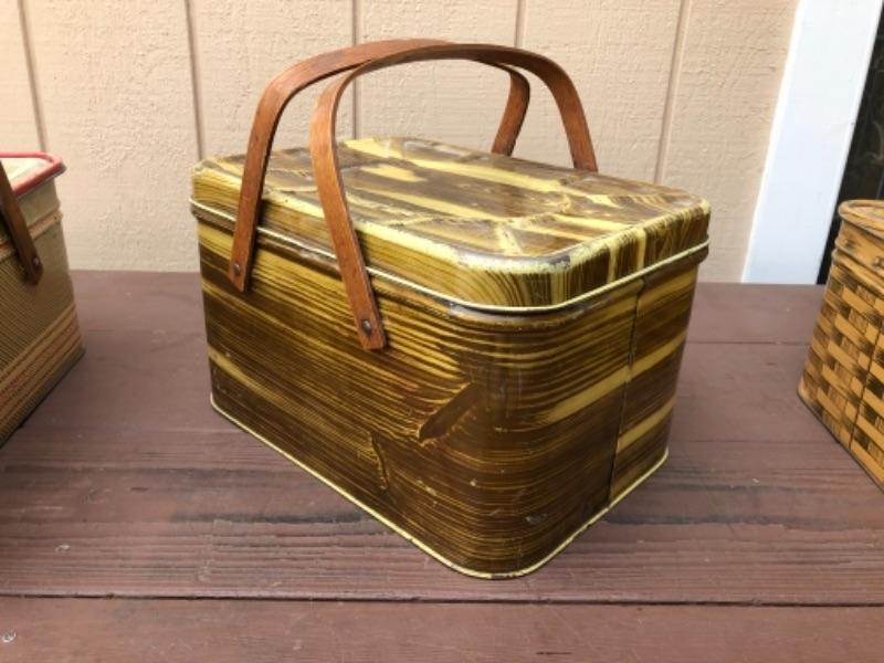 Lots 213, 311, 346: Pic Nic Lunch Pail: Tin, Faux Wood; Brown Picnic Lunch Box: Metal, Faux Basket Weave; Yellow Picnic Lunch Box: Mini Check Pattern, Tin,1950’s, All Wood Handles