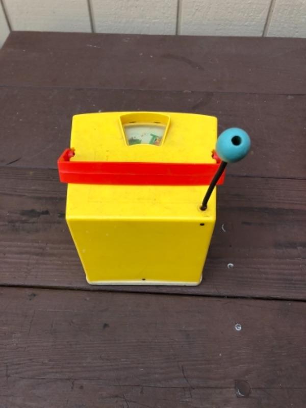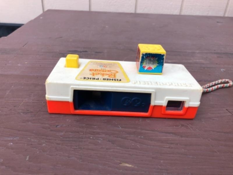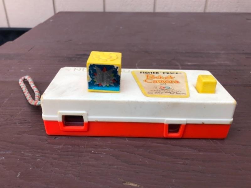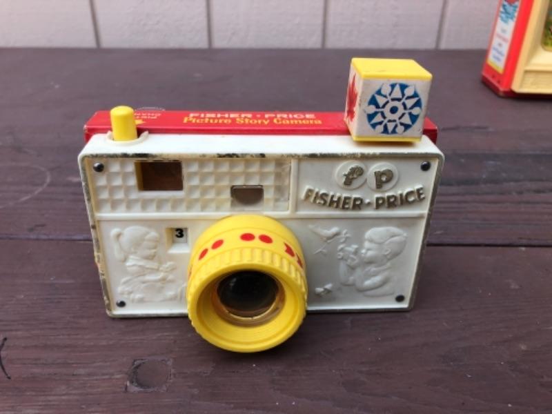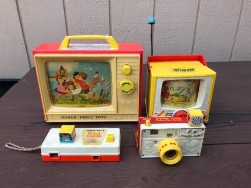 Lots 228, 283, 285, 388: Peek-A-Boo Screen: Fisher Price Toys, 1963; Fisher Price Story Camera, 1974; Fisher Price Pocket Camera , 1967; Fisher Price Giant Screen Music Box TV, 1966