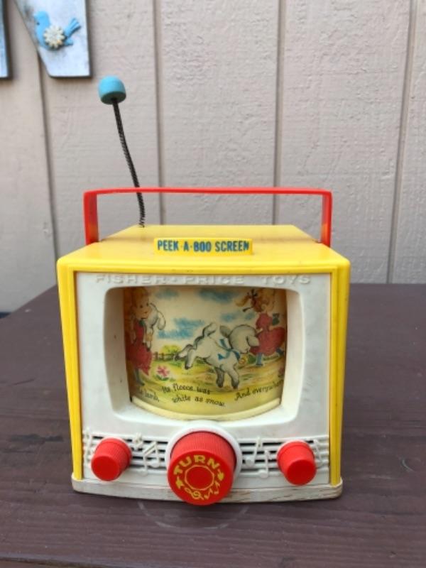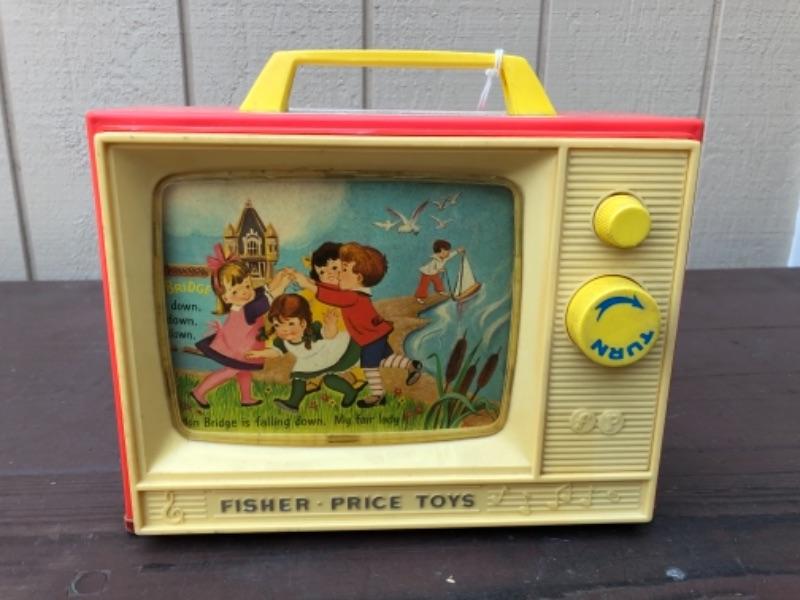 Lots 228, 283, 285, 388: Peek-A-Boo Screen: Fisher Price Toys, 1963; Fisher Price Story Camera, 1974;  Fisher Price Pocket Camera , 1967; Fisher Price Giant Screen Music Box TV, 1966