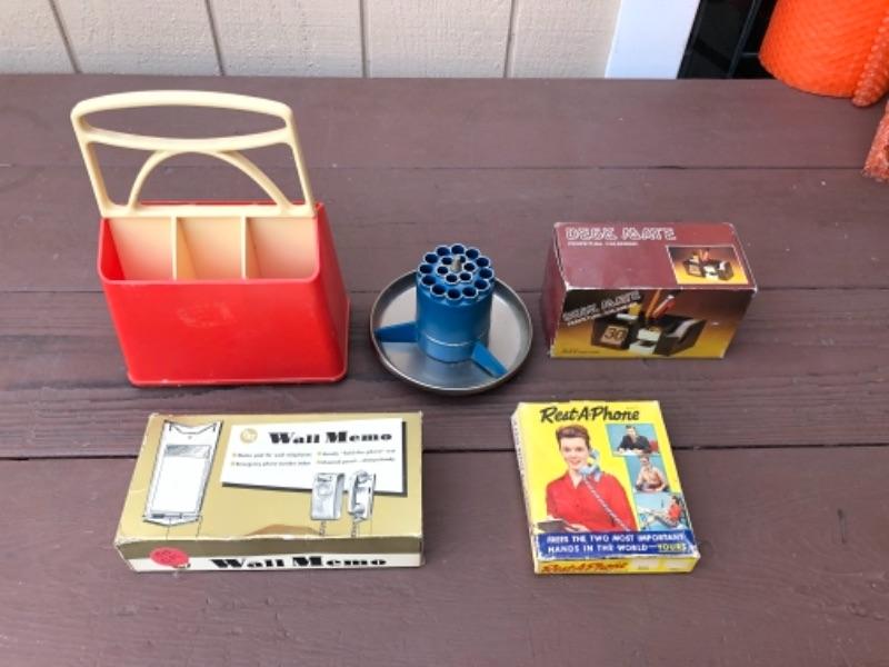 Lots 60, 97, 124, 262, 362: Wall Memo, boxed; Blue and Silver Pencil Holder on Lazy Susan: Metal and Plastic, Rest-A-Phone: Boxed, Child’s Craft Caddy, Desk Mate and Perpetual Calendar: Boxed, Made in Hong Kong, 1950’S - 70’S