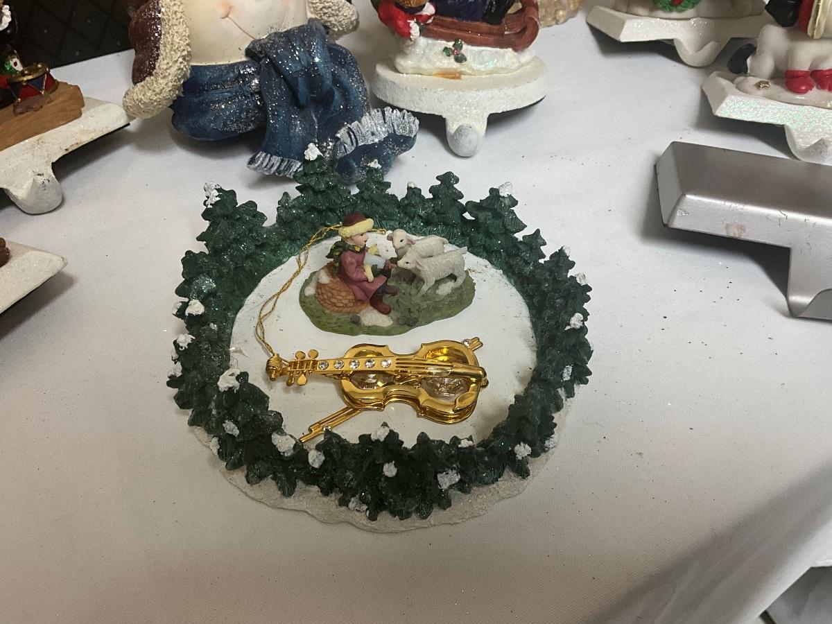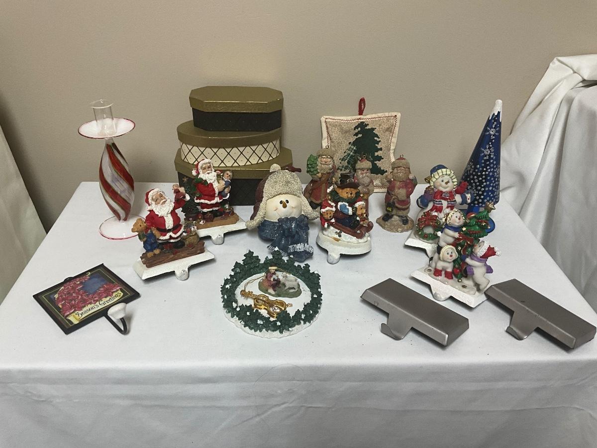 Lots of Christmas! 8 Stocking Holders, 3 Santas, 3 Boxes, candy cane swirl candle holder, and blue tree