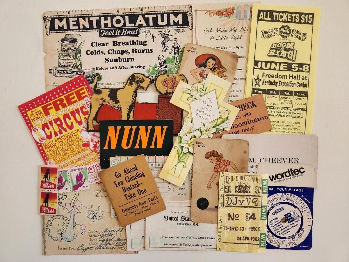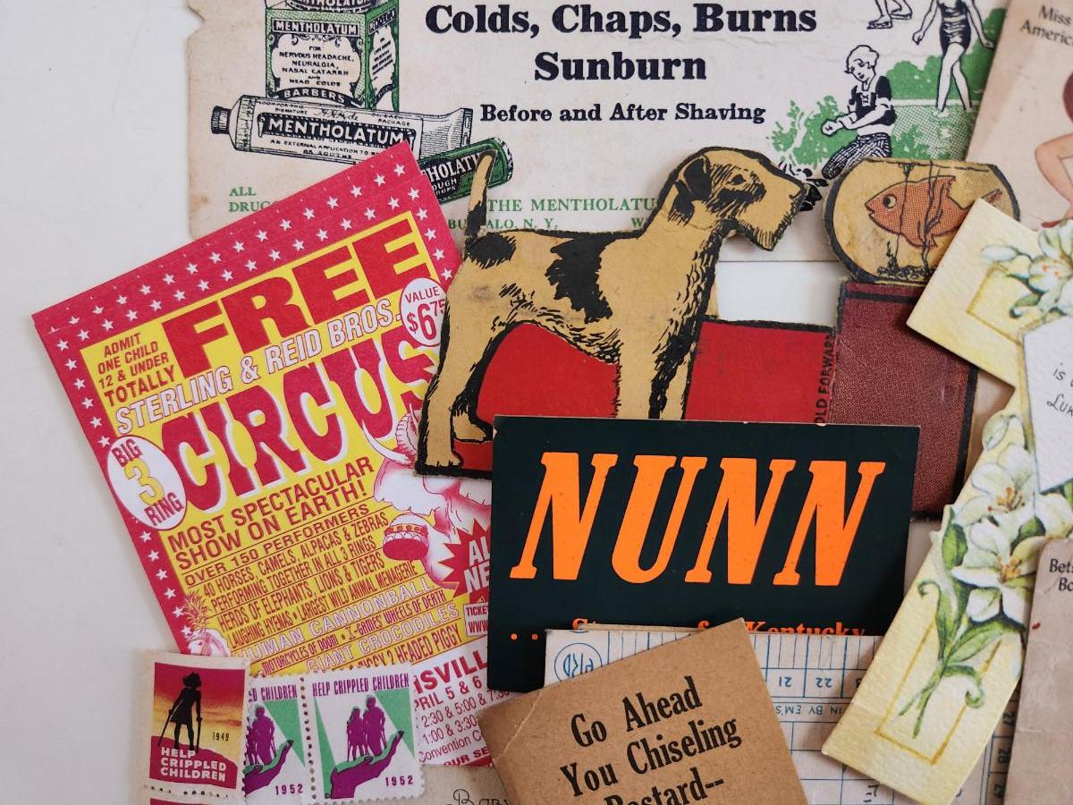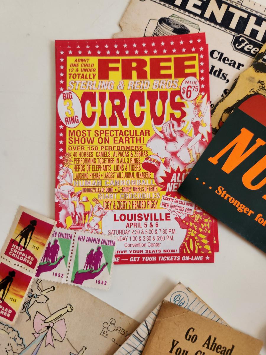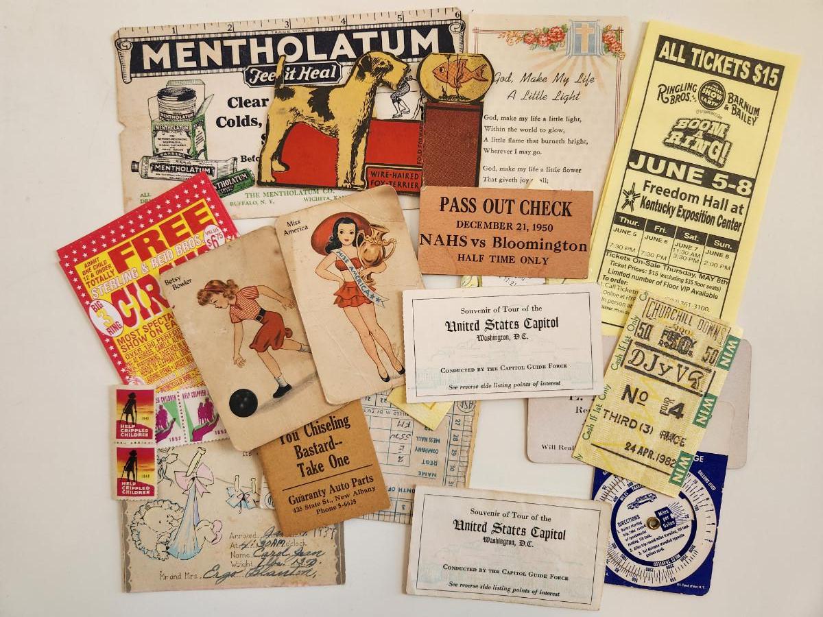 This lot is for Lots of Paper Ephemera. This grouping is chock full of interesting 'snip-its' of the past. From old wager tickets to coupons for circus discounts, plus old advertising, stamps and a vintage mileage calculator. Where you gonna find it.
