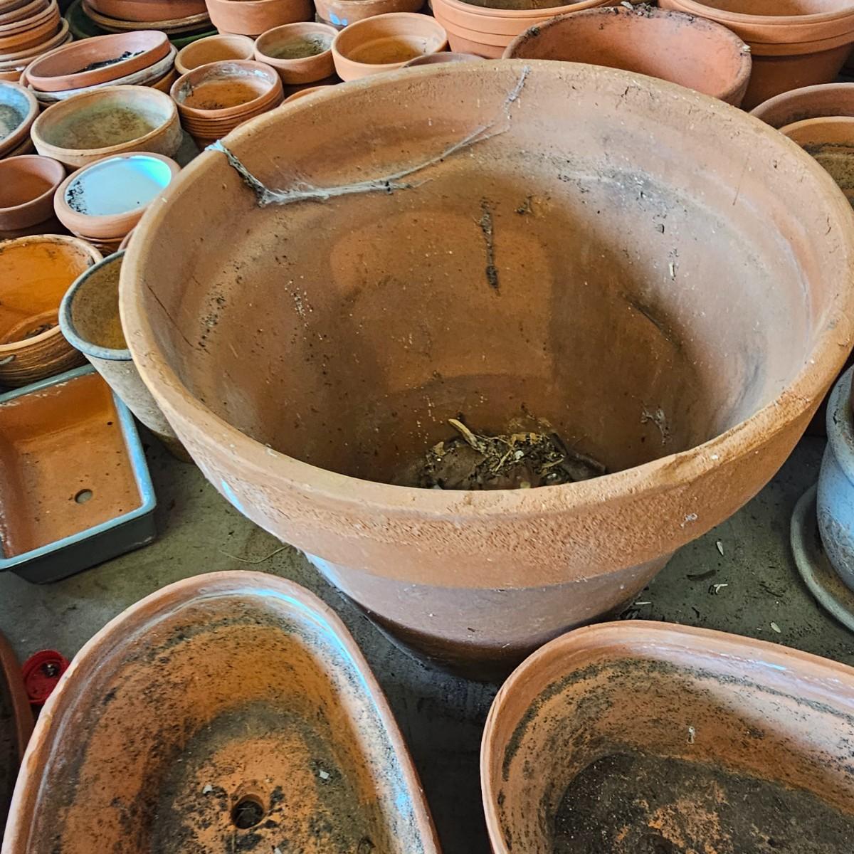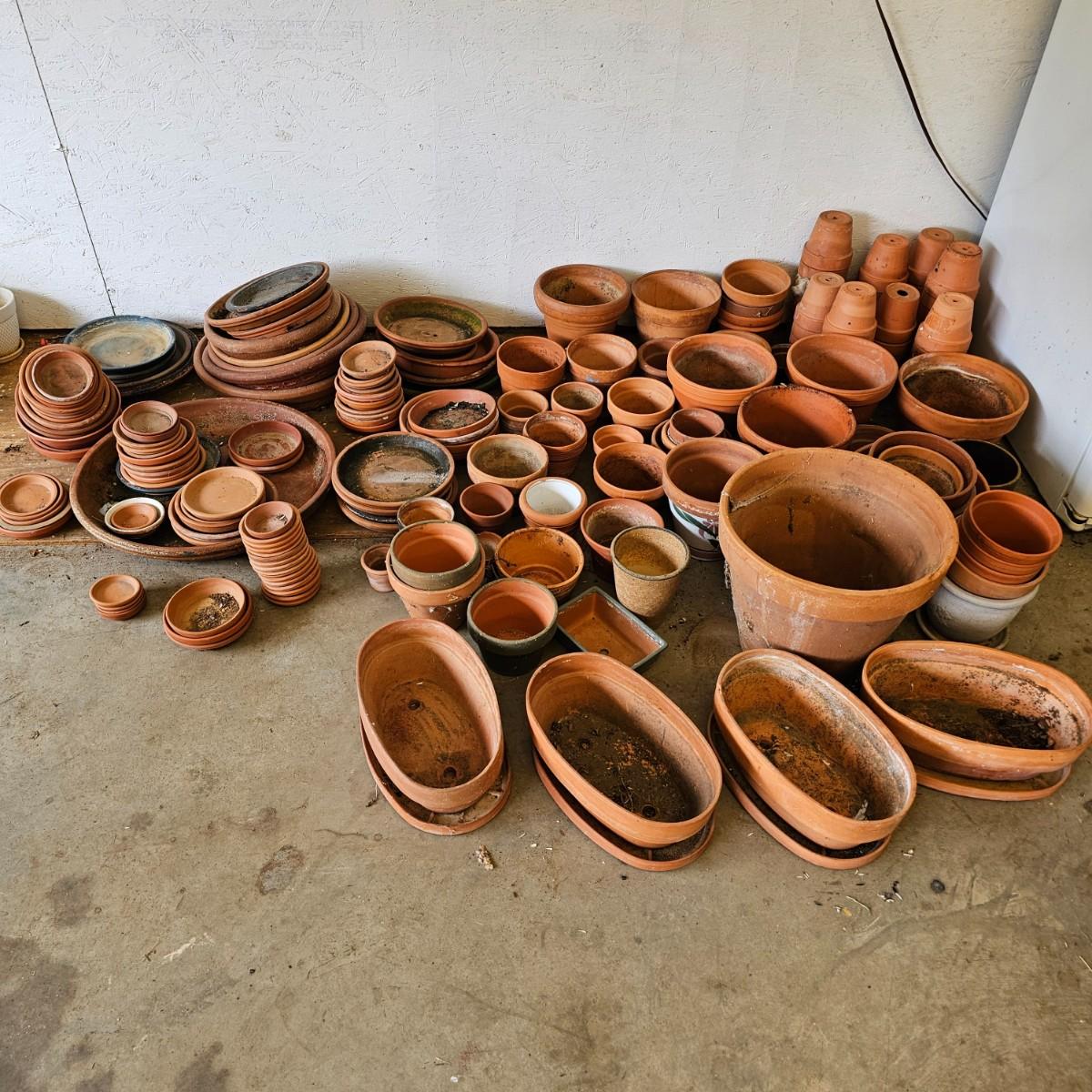 Over 200 pieces of terra cotta in this wonderful garden group. Saucers and trays from 3.25"D to 21"D. Some variation in colors, 97 pieces. Pots are mostly round, some oblong items. Round pots range from 3.25"D to 15"D. Oblong items are 8" x 14" x 6"H. 109 items. Some minor discoloration and chips, most have been used previously. See photos for details. Local pickup only.