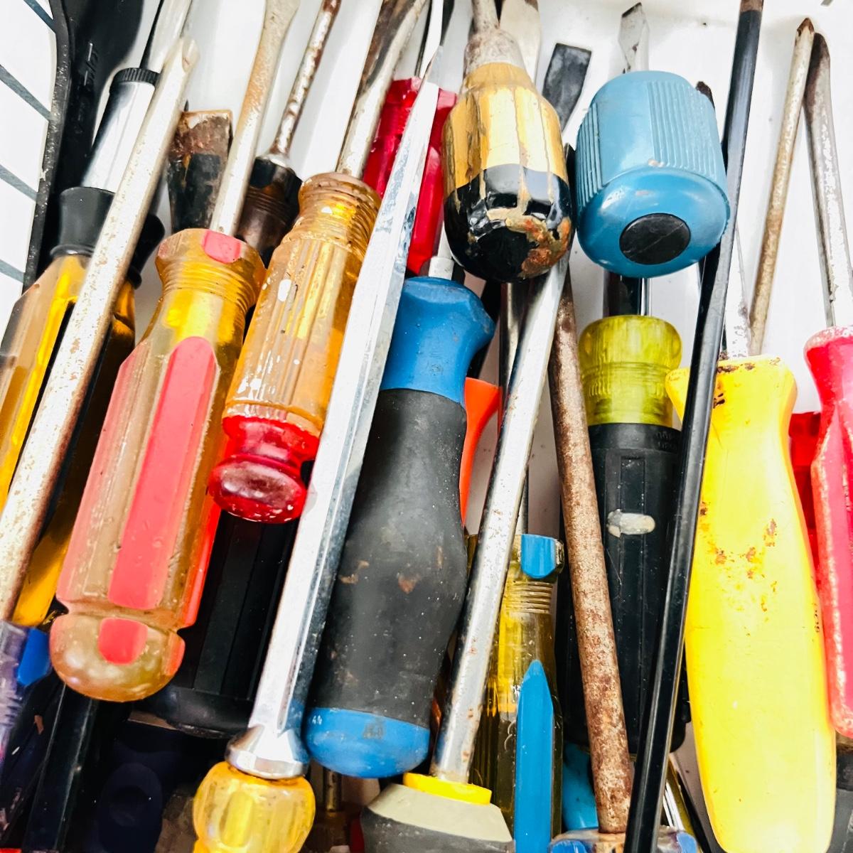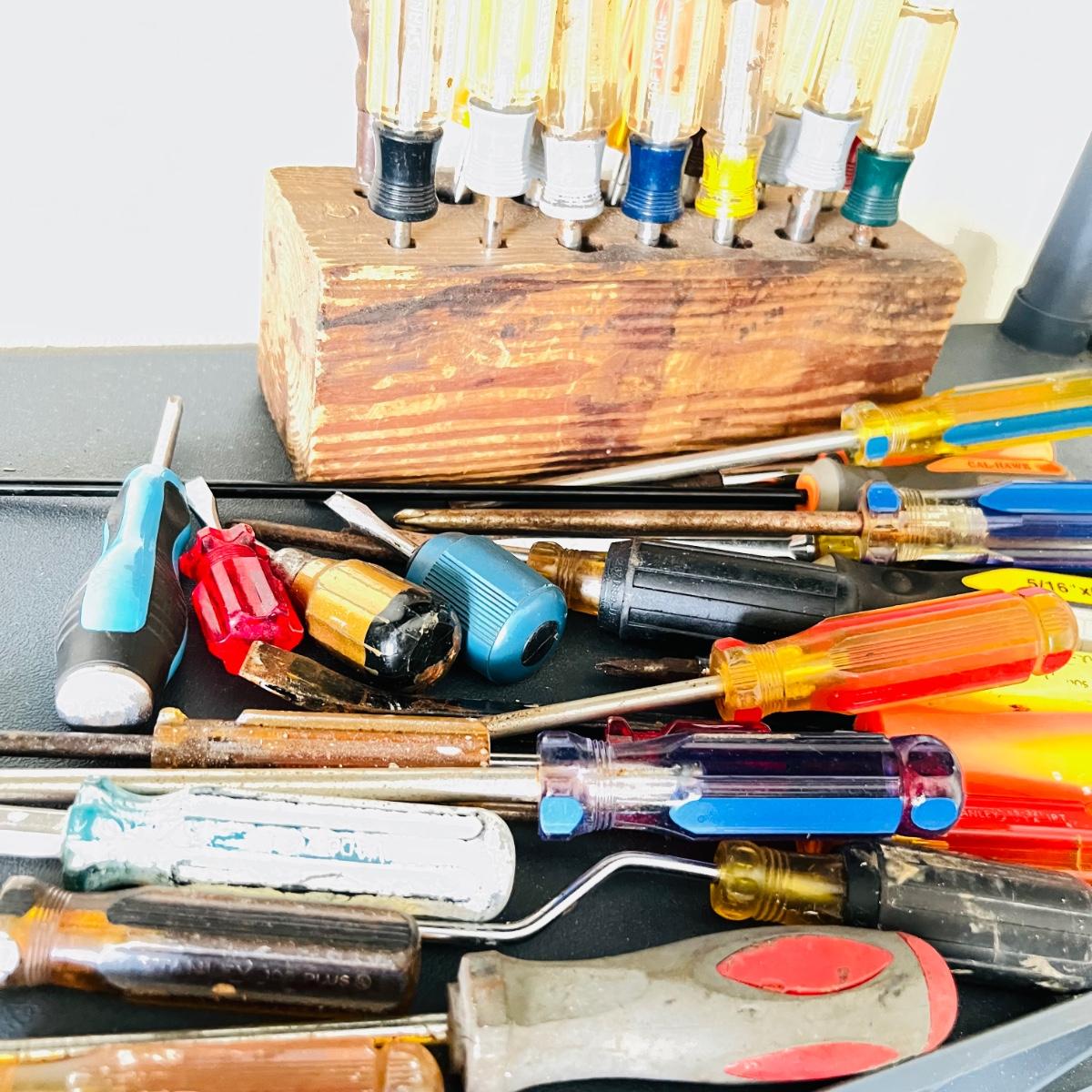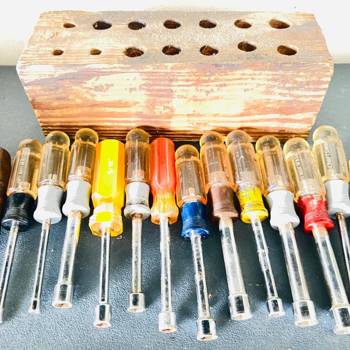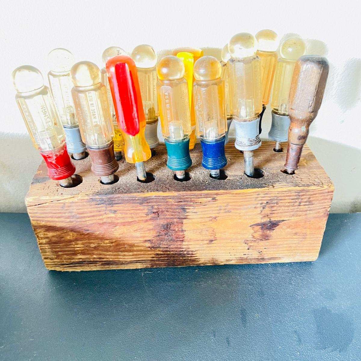 Lot includes over 40 screwdrivers all different sizes and a wood holder that holds 14 screwdrivers. Block measures 10”x4”x4”.