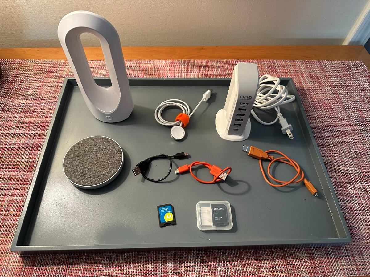 Gray Tay, Multi USB Power Charger with cord, Charger - wiagry 100012567, Enbrighten Lamp - changes colrs, 1watch charger, charging cords, samsung Micro SD adapter, Motorola micro sd adapter