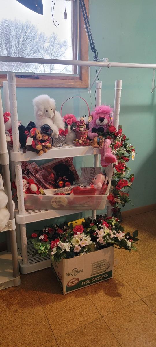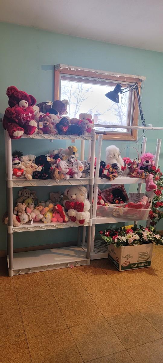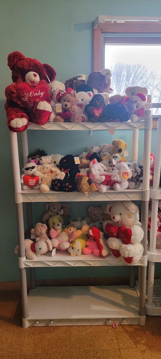 Two shelves full of stuffed animals, floral abd bin full of miscellaneous. Shelves excluded.