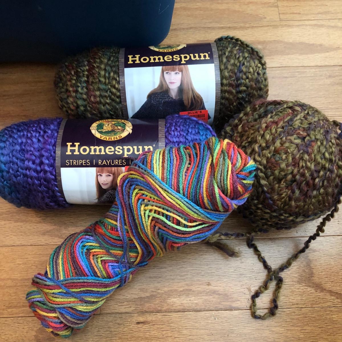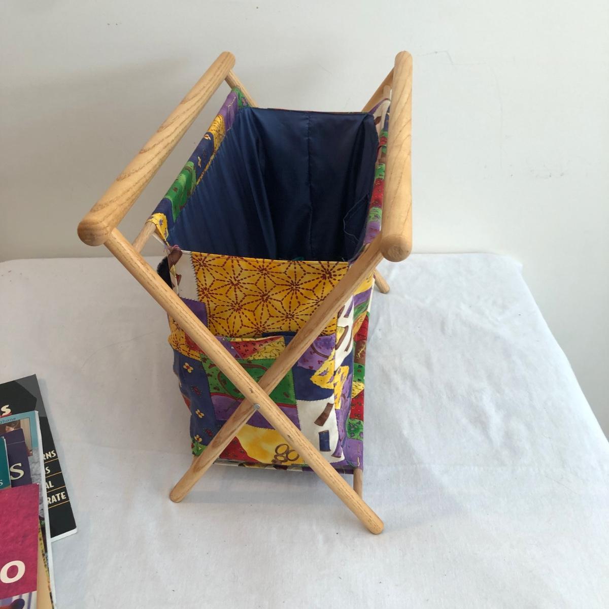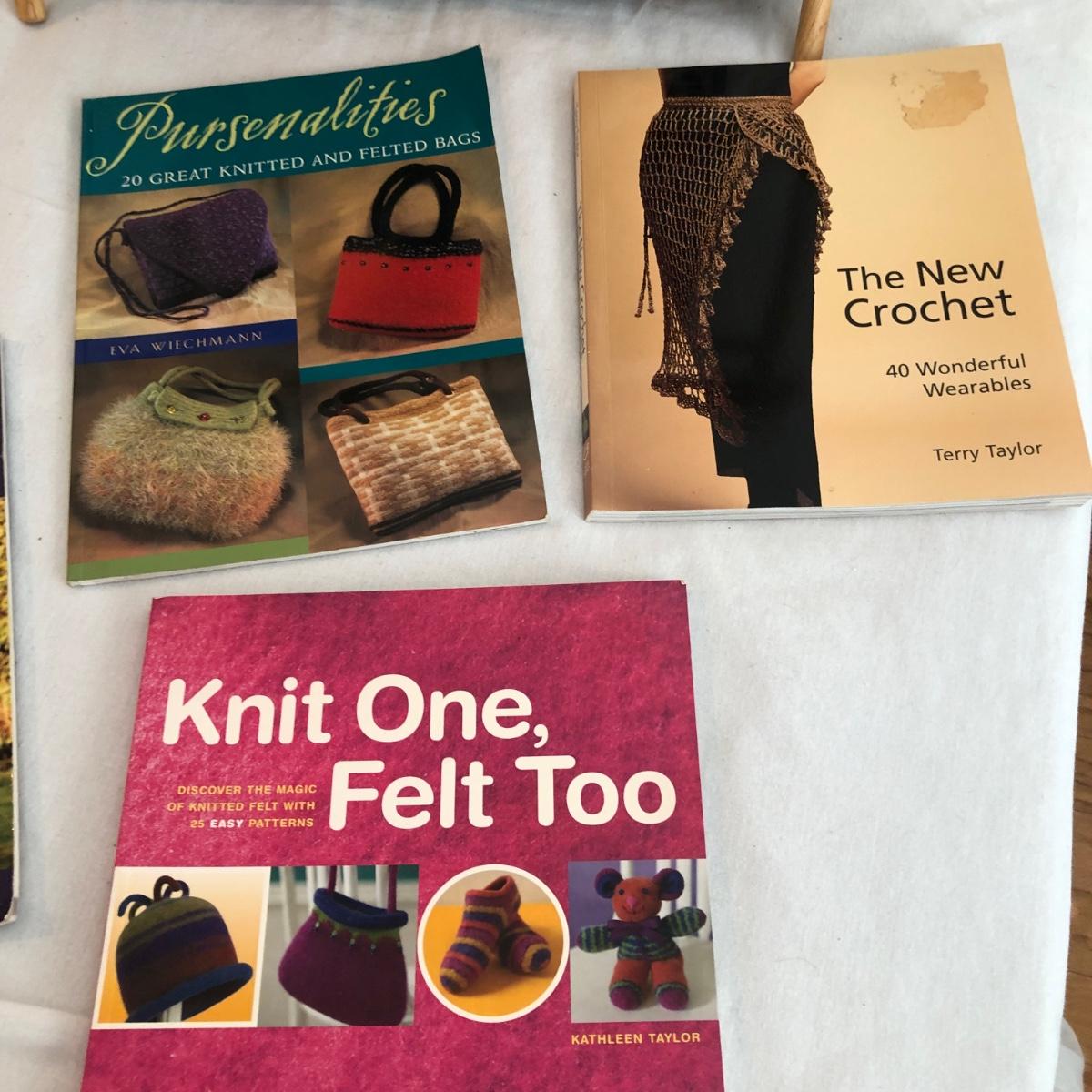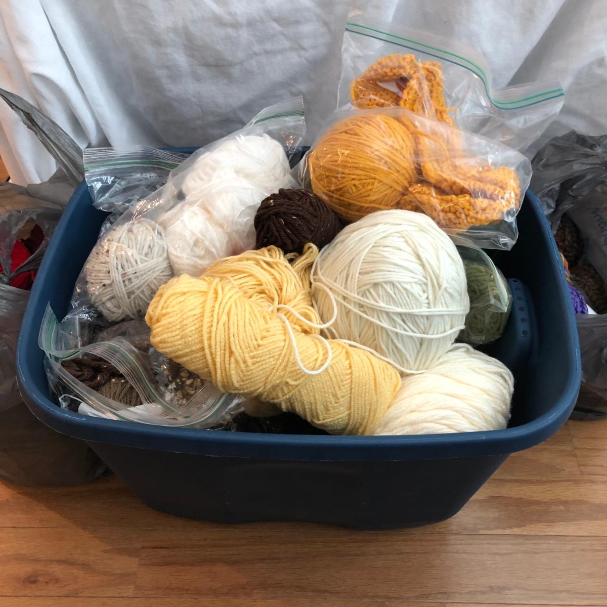 There is a lot of yarn in this lot! There is a bin full (14” x 18.5” x 13”), a sewing bag full and a plastic bag full. There is also a sewing bag and sewing holder on a wooden frame (9.5” x 19” x 13.5”). The pocket of the standing sewing bin is filled with needles and other supplies. There is also six books! Shipping Available.