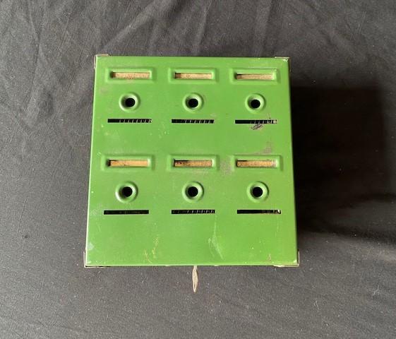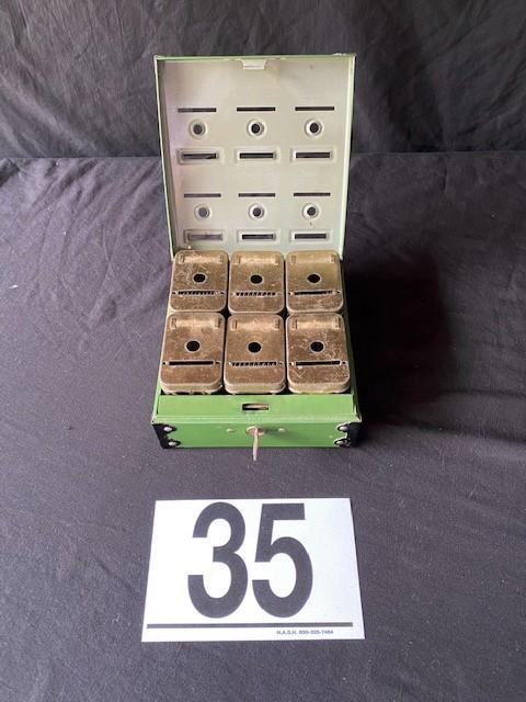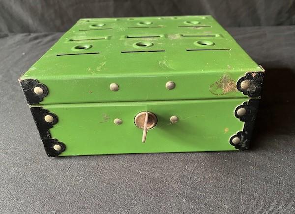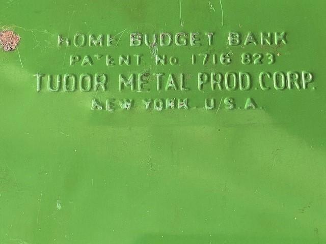 "Home Budget Bank". Metal box with key. Estimated weight of lot: 2lbs. Measurement: 6" 6" 2 1/2"