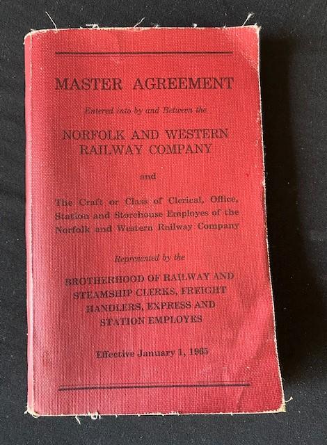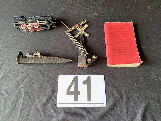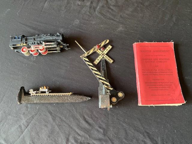 Includes: locomotive, crossing signal, railroad spike & Master Agreement(dated 1965) Norfolk Western Railway. Estimated weight of lot: 3lbs. Measurement: 8"L x 4"W x 2"D (largest item)