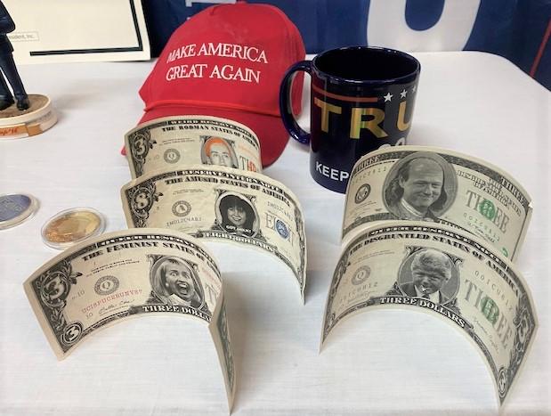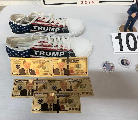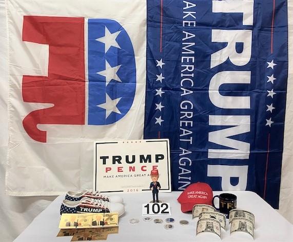 Includes: flag, shoes, faux dollar bills, coins, mug, hat & more