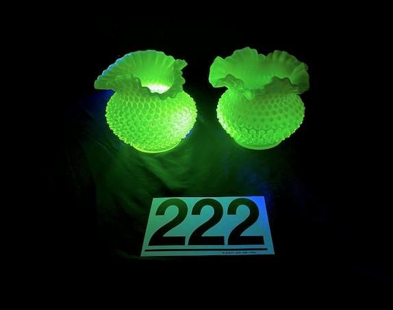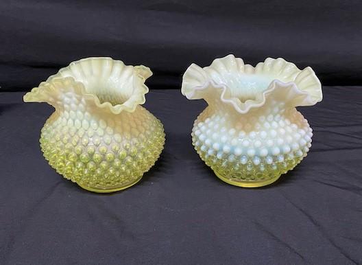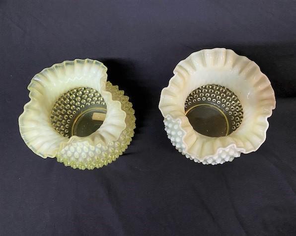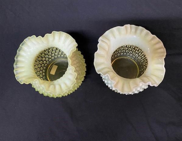 LOT#U222: Hobnail Ruffled Opalescent Vaseline Glass Vases