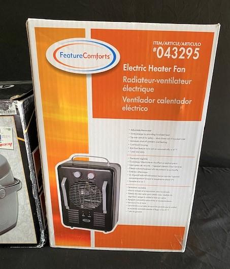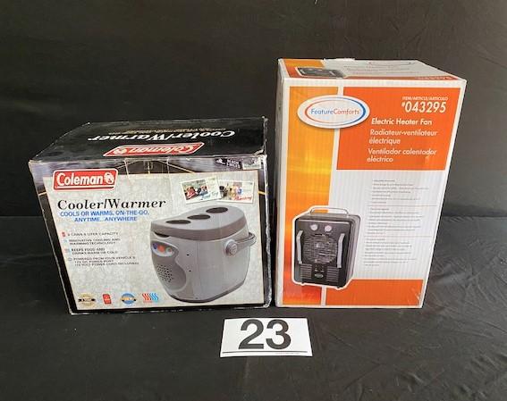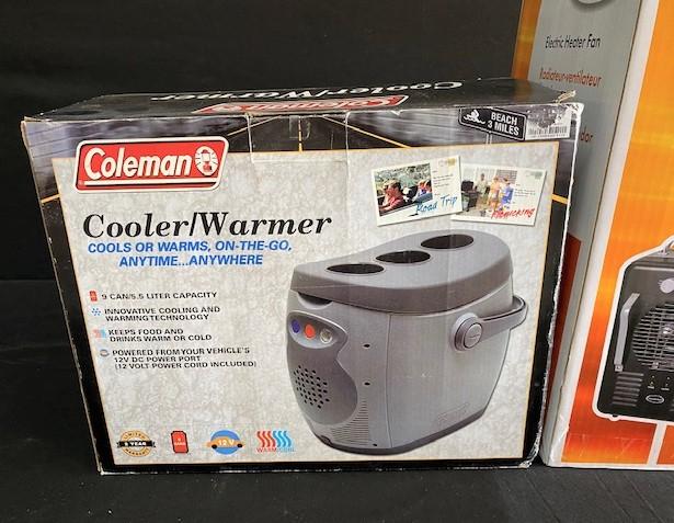Coleman appears to be new/unused. Feature Comforts powers on at time cataloging. Coleman Cooler/Heater & Feature Comforts Electric Heater. Estimated weight of lot: 10lbs. Measurement: 16"H x 10 1/2"W x 9"D (largest)