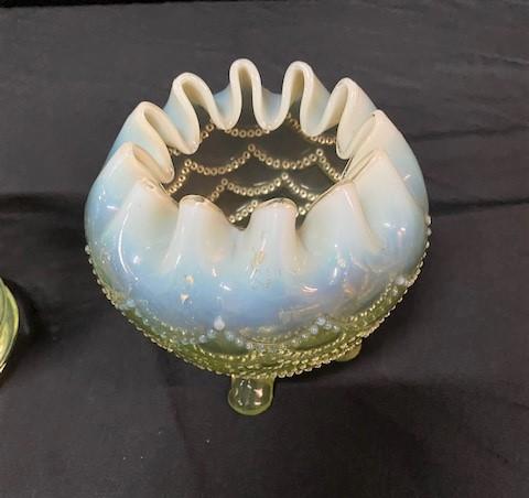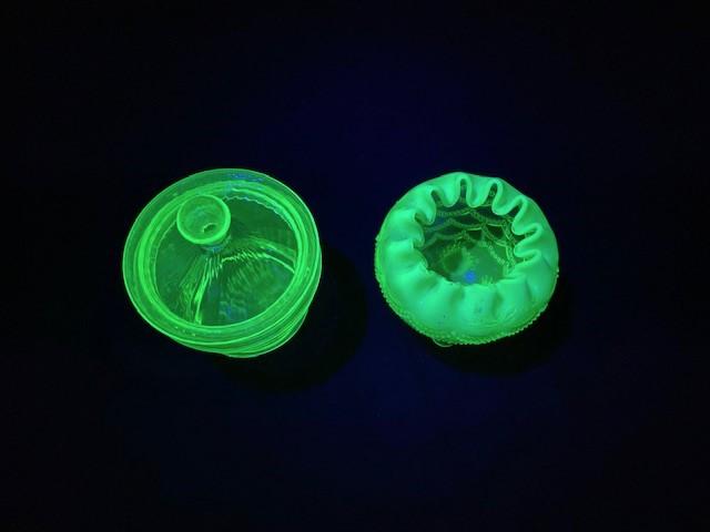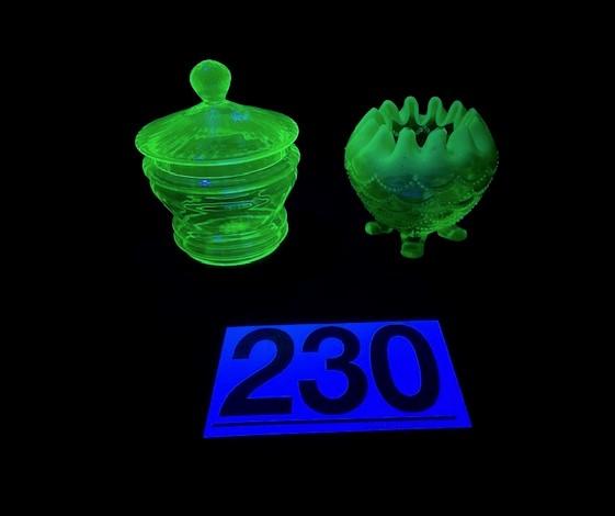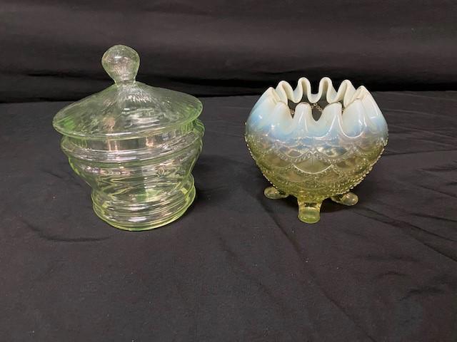LOT#U230: Vaseline Glass Covered Candy Jar & Opalescent Dish