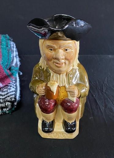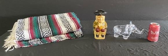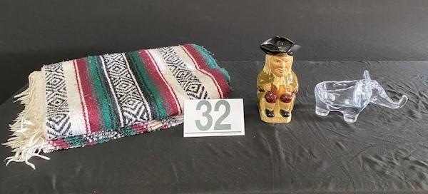 Including: throw blanket, Toby mug & signed Vannes French glass elephant pipe holder. Estimated weight of lot: 5lbs. Measurement: 8"H x 6"W (Toby)