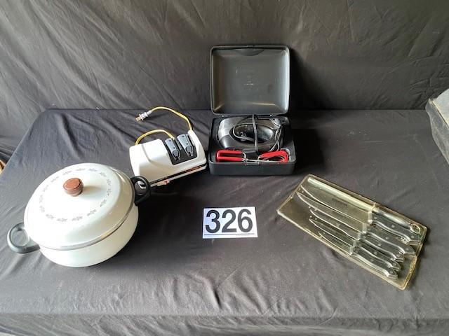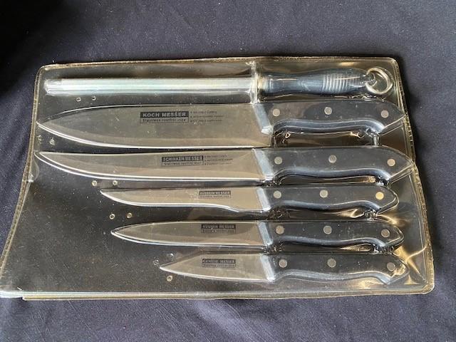 Some NOS. Includes: mixer, knife sharpener, Koch knives & dutch oven. Measurement: 8" x 11" (largest)