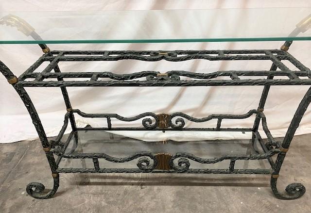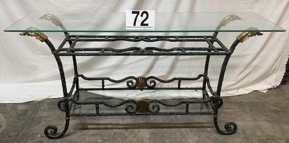 Sturdy, textured piece with 2 tier glass; one lower & one top. 1/2" glass top. Measurement: 54"L x 14"D x 28 1/4"H