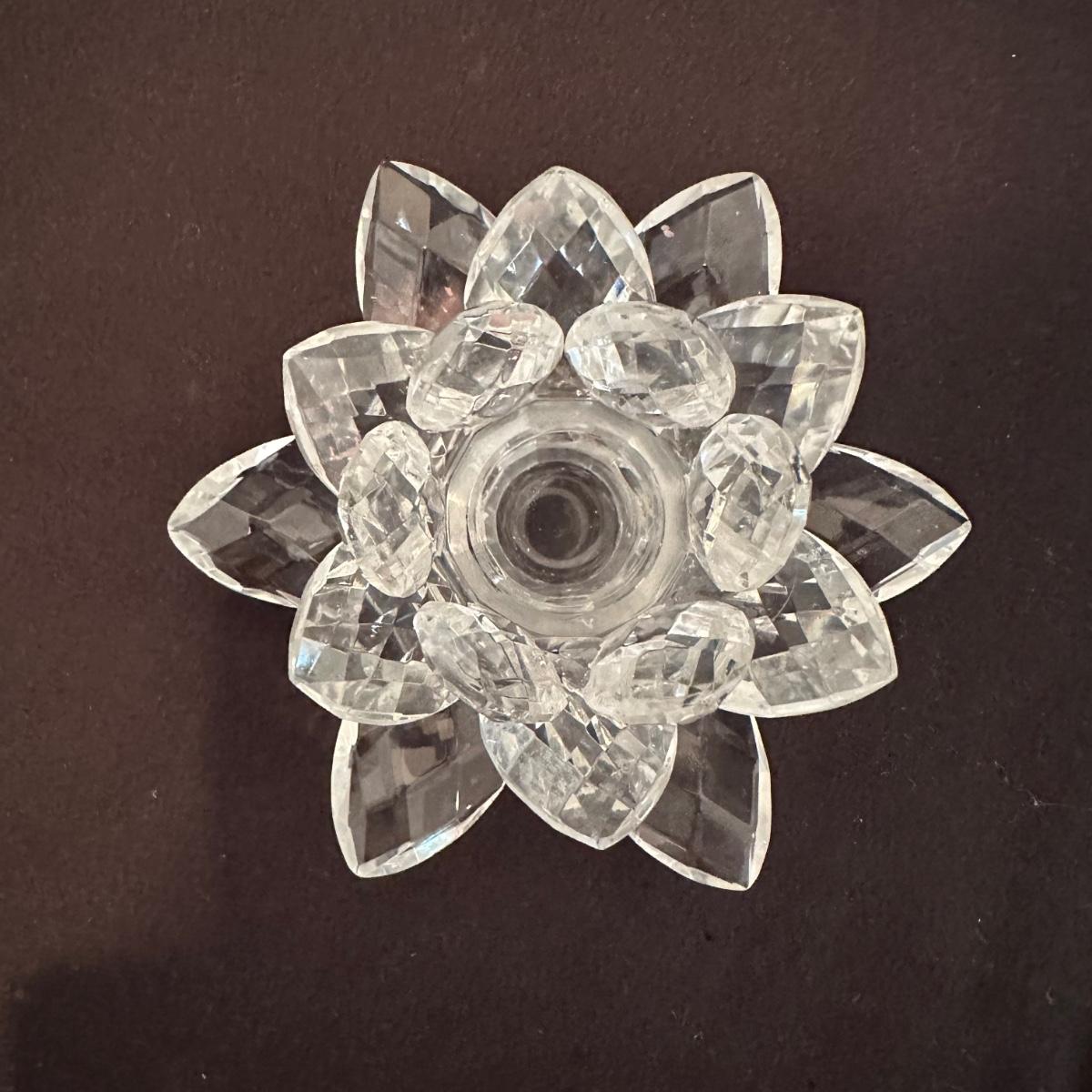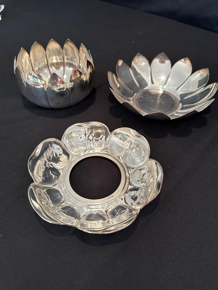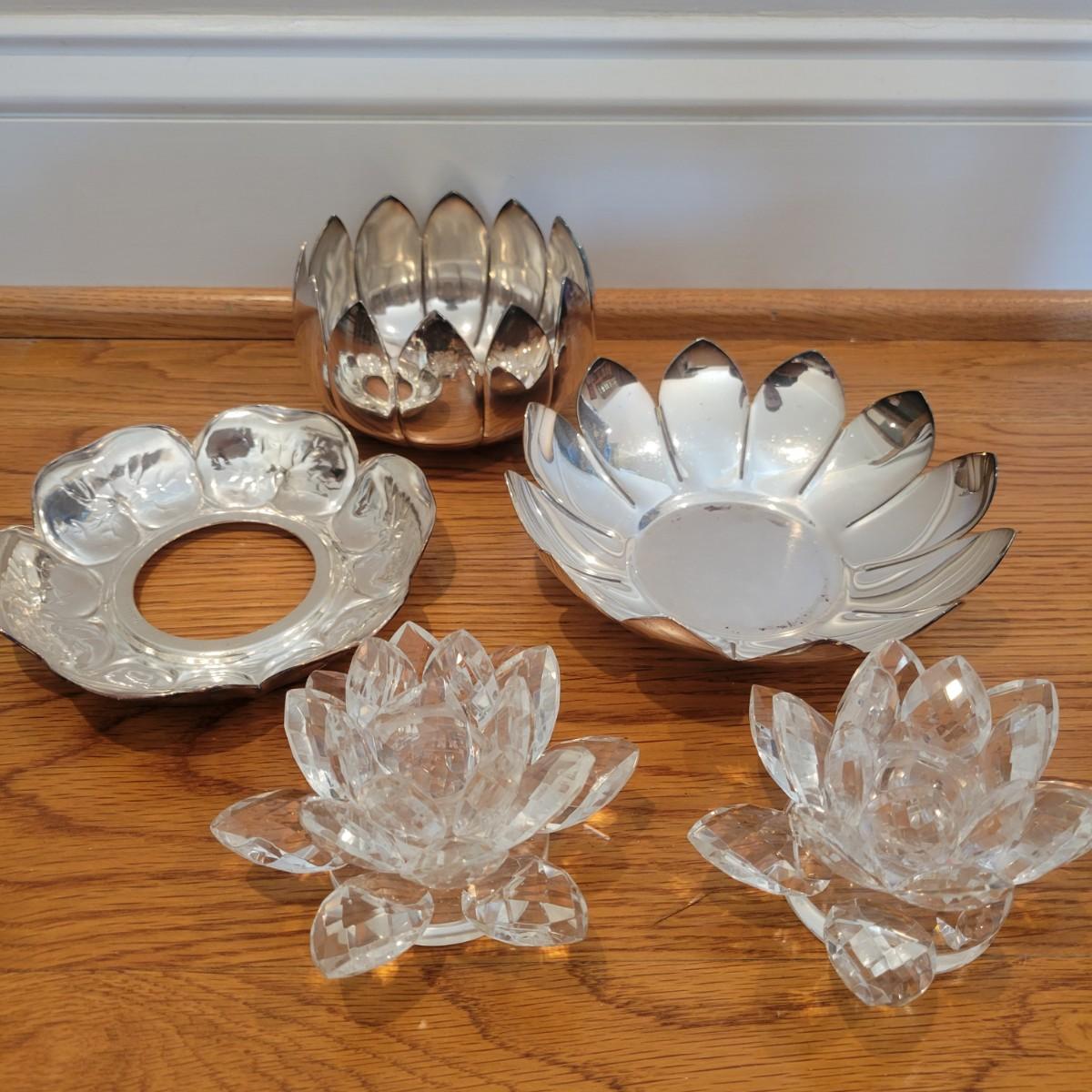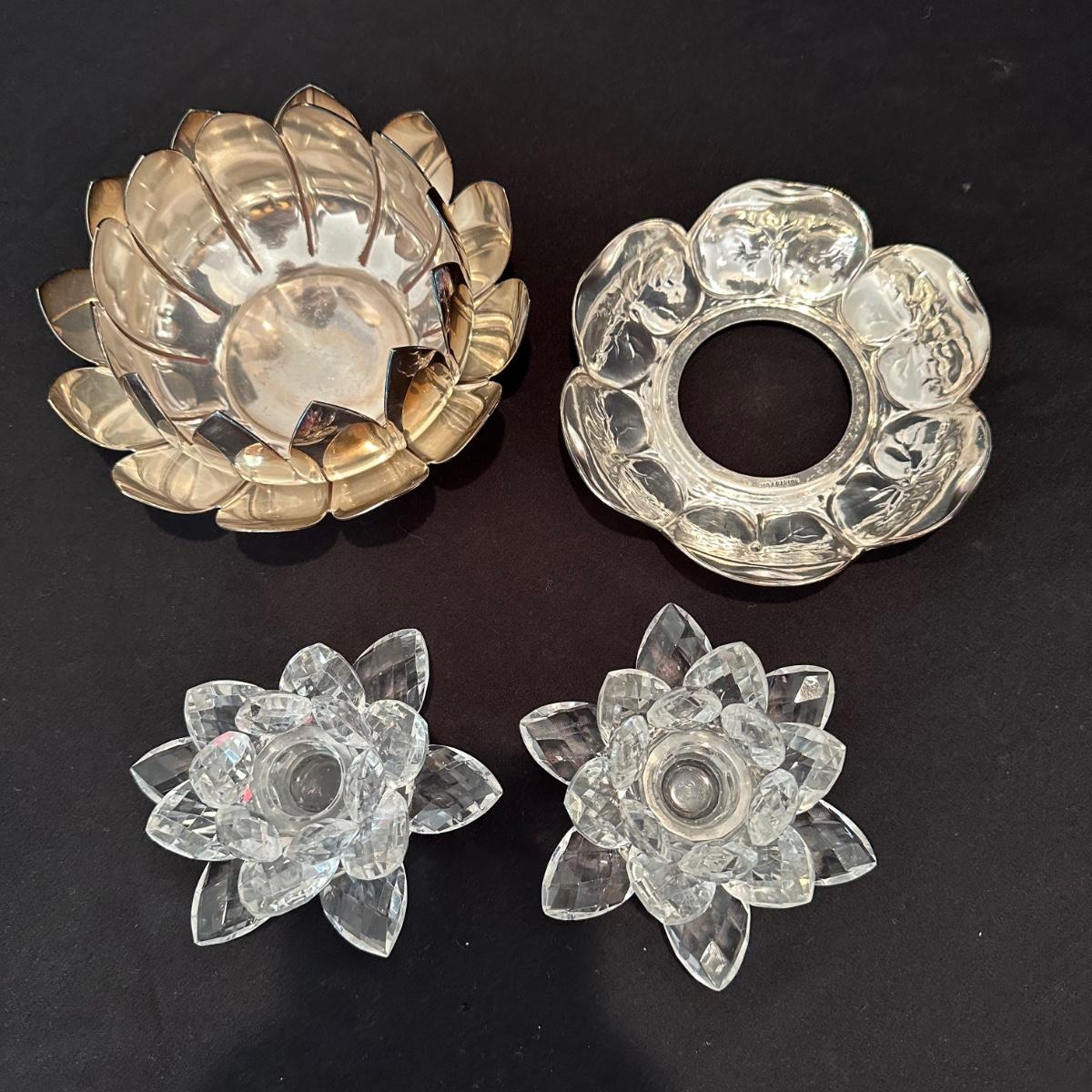 An assortment of stamped metal and crystal candleholders. The three metal candle holders are stamped Reed and Barton and are possibly plated silver. The largest of the three measures approximately 6.5"D x 2"H. The clear lotus holders appear to be crystal but is not confirmed. One petal is broken and needs to be repaired. Shipping available.
