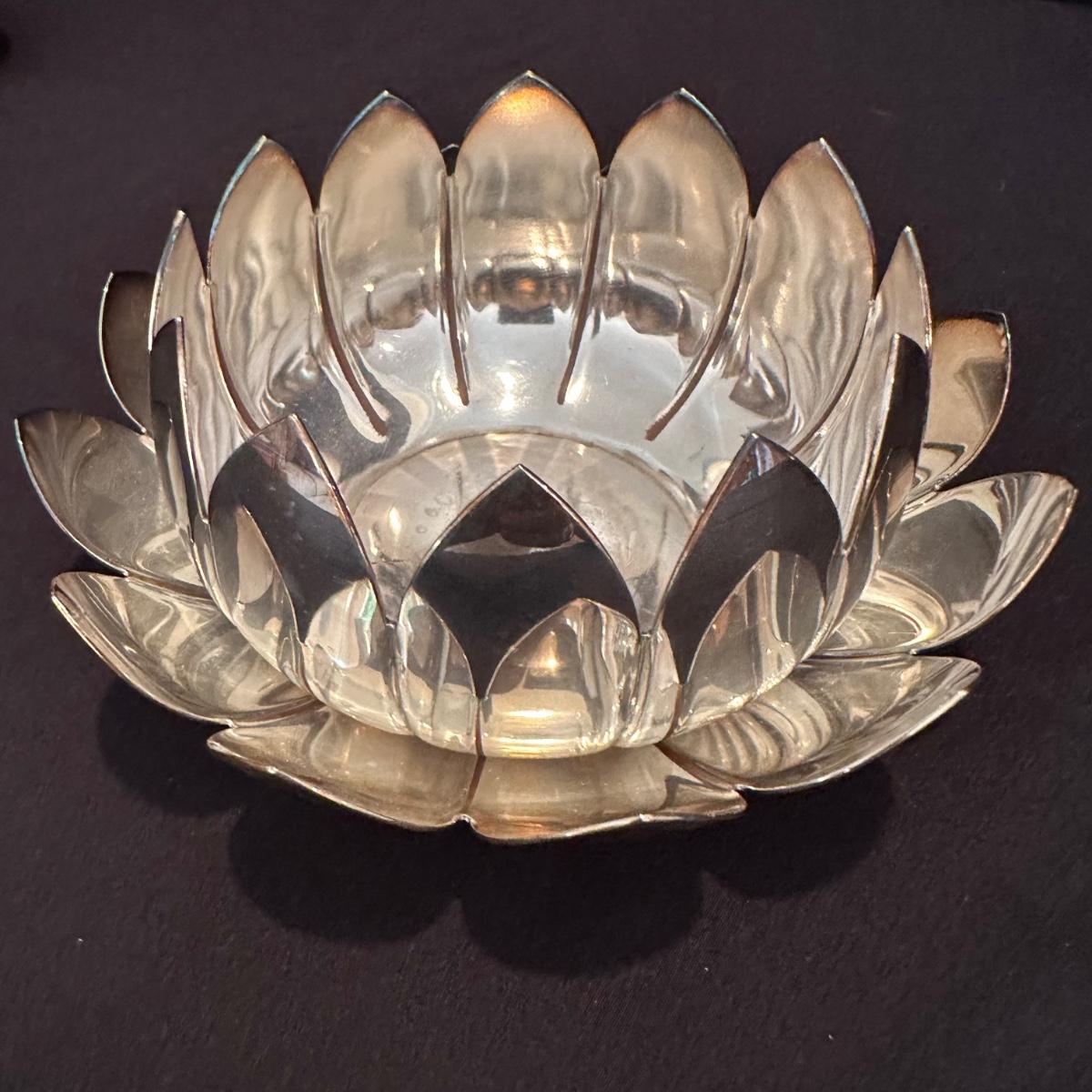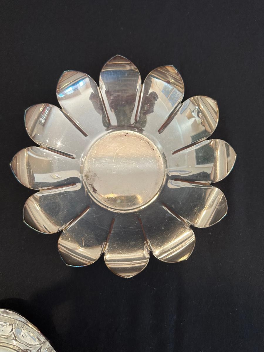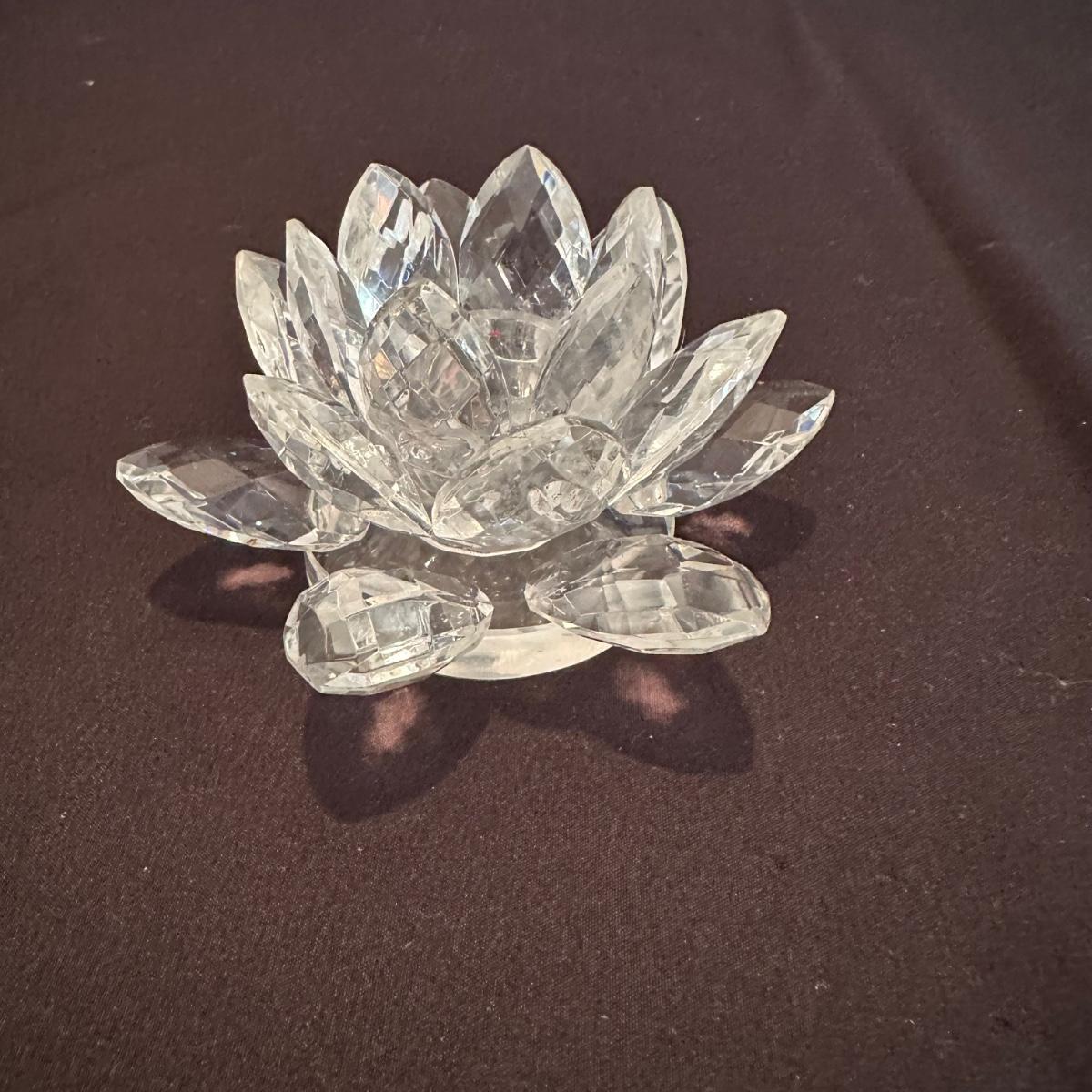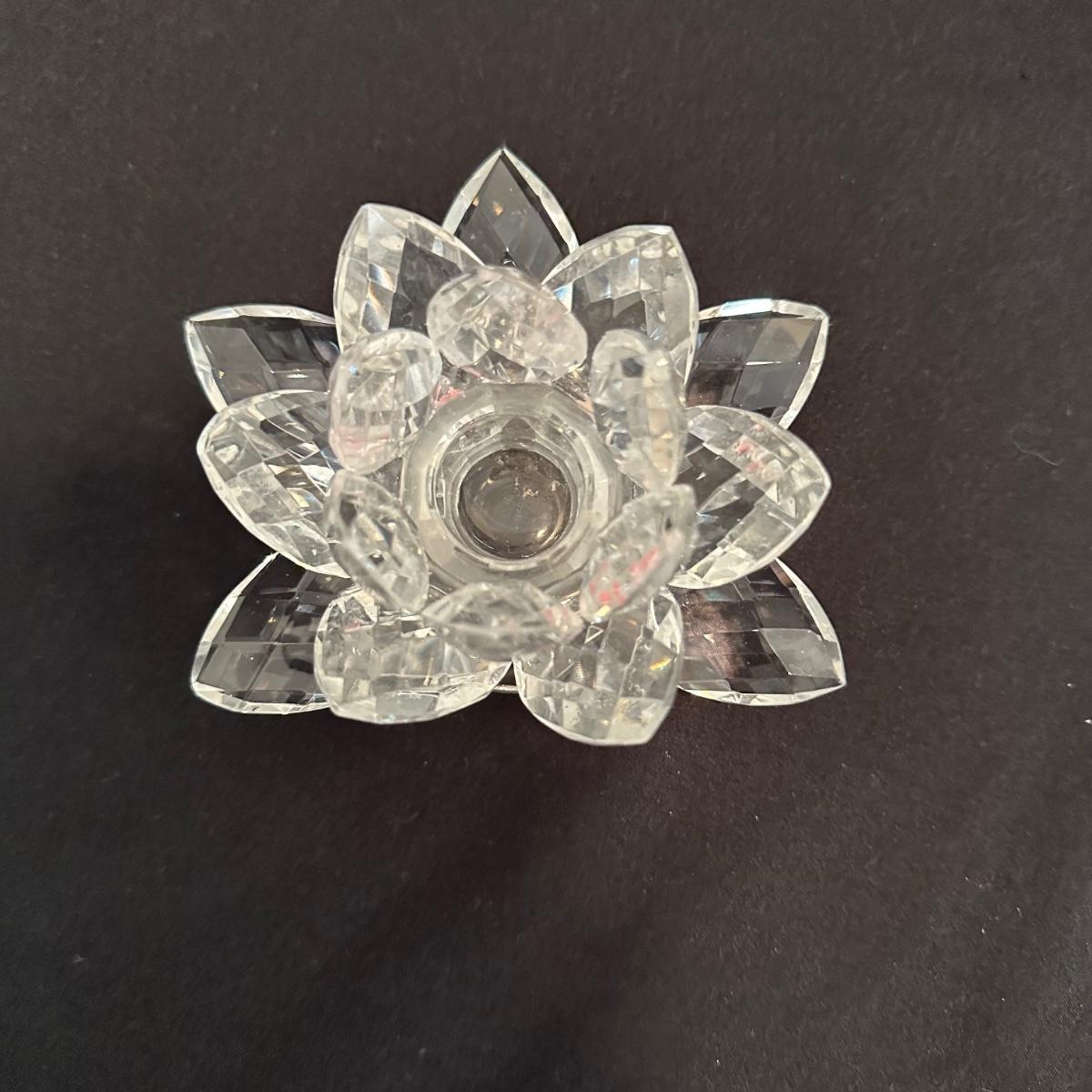 An assortment of stamped metal and crystal candleholders. The three metal candle holders are stamped Reed and Barton and are possibly plated silver. The largest of the three measures approximately 6.5"D x 2"H. The clear lotus holders appear to be crystal but is not confirmed. One petal is broken and needs to be repaired. Shipping available.