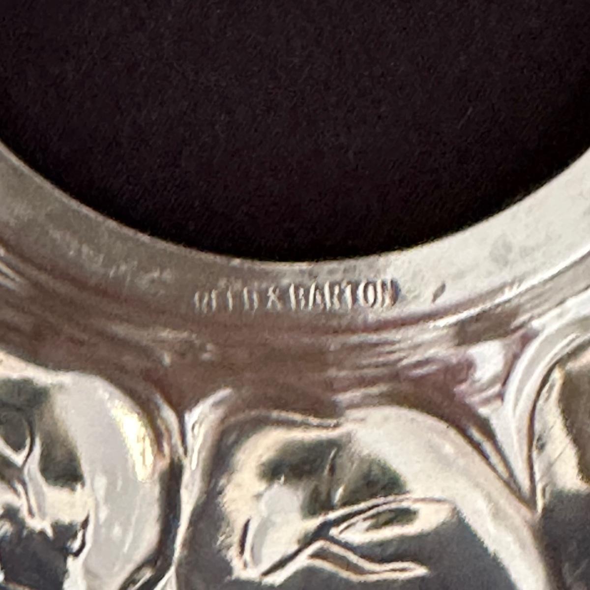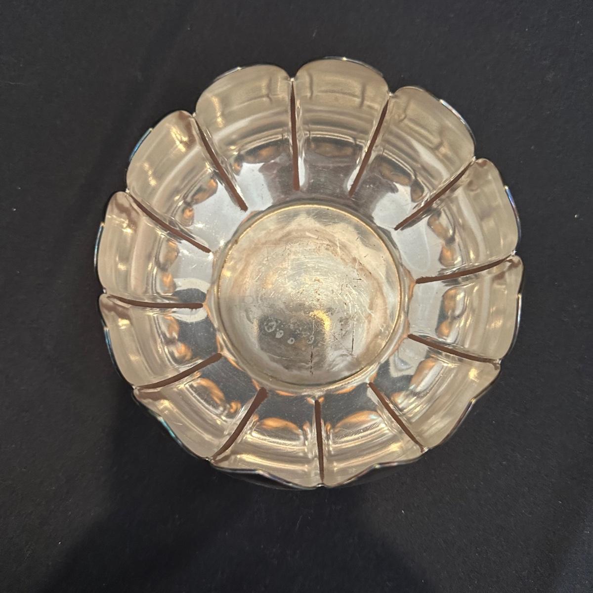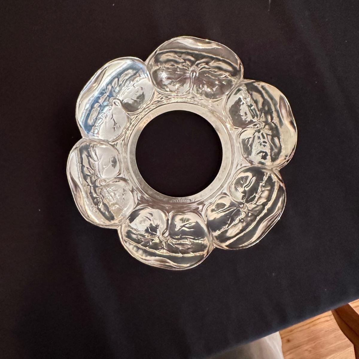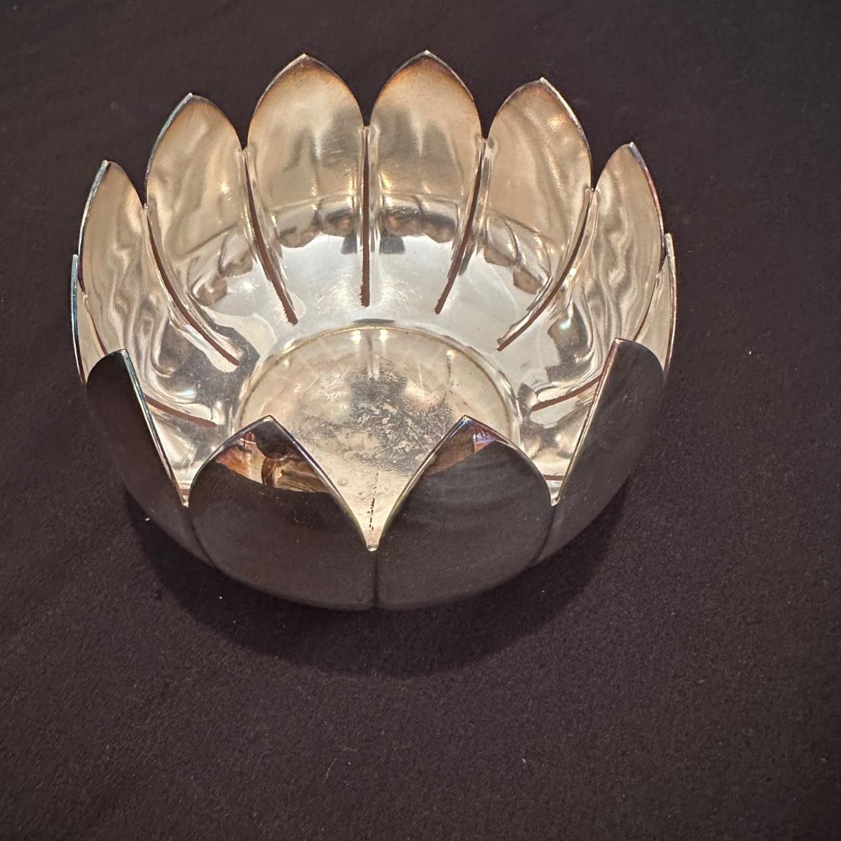 An assortment of stamped metal and crystal candleholders. The three metal candle holders are stamped Reed and Barton and are possibly plated silver. The largest of the three measures approximately 6.5"D x 2"H. The clear lotus holders appear to be crystal but is not confirmed. One petal is broken and needs to be repaired. Shipping available.