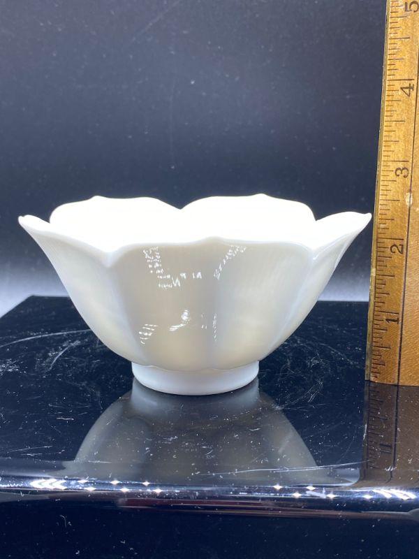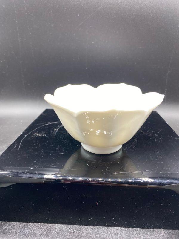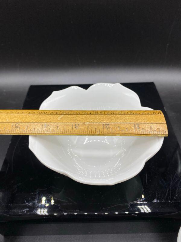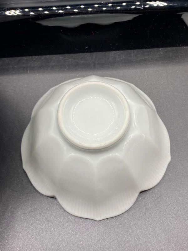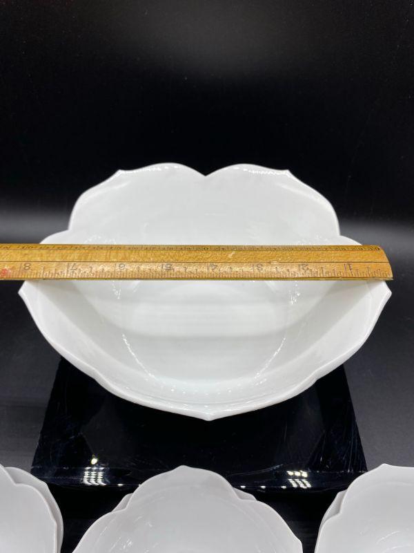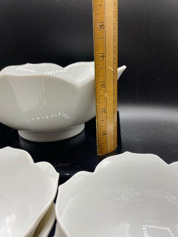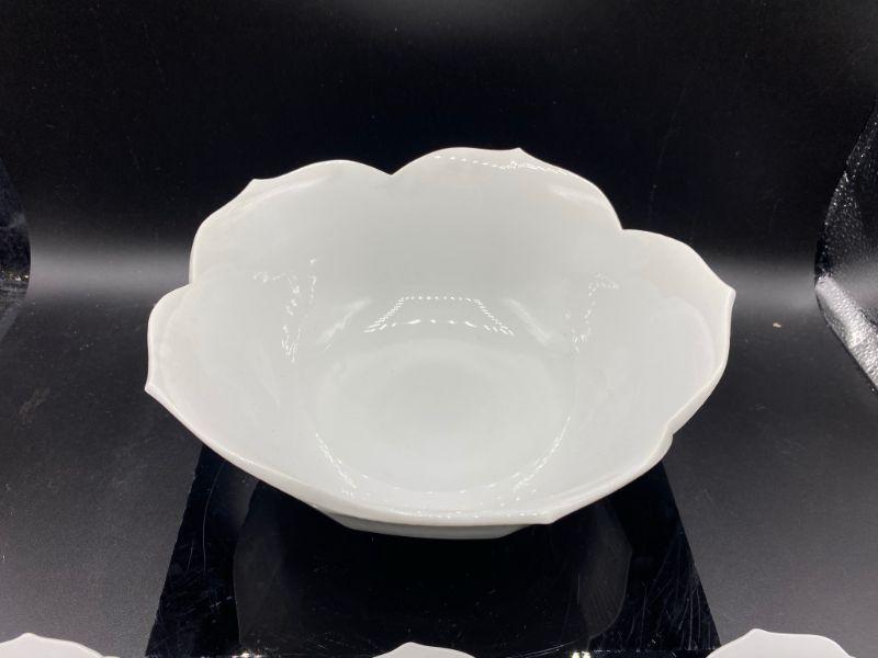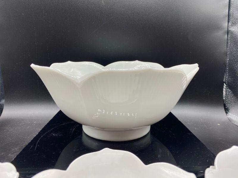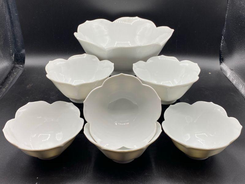 White lotus flower bowl set. Comes with a serving bowl and 6 smaller bowls. Great condition. Unmarked.