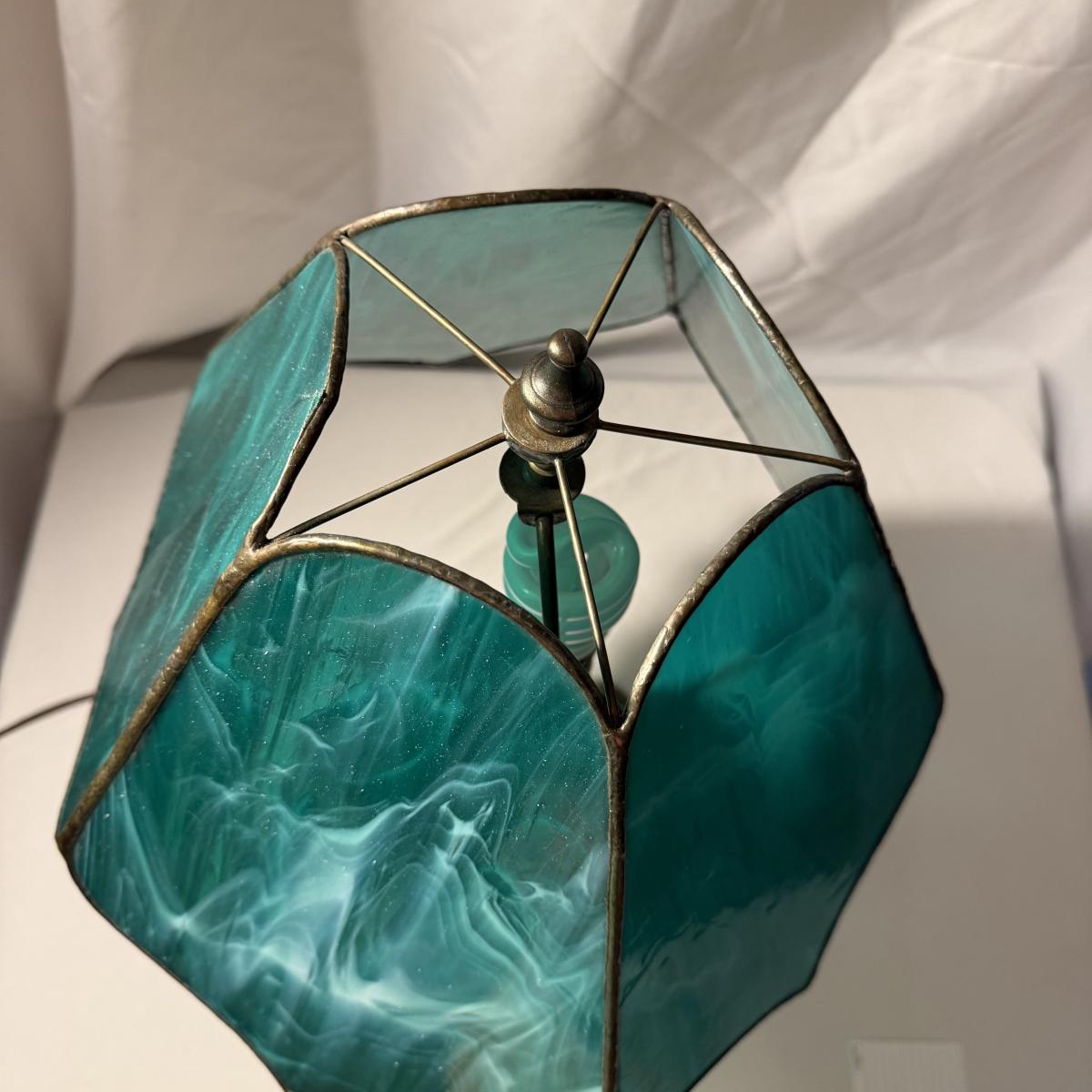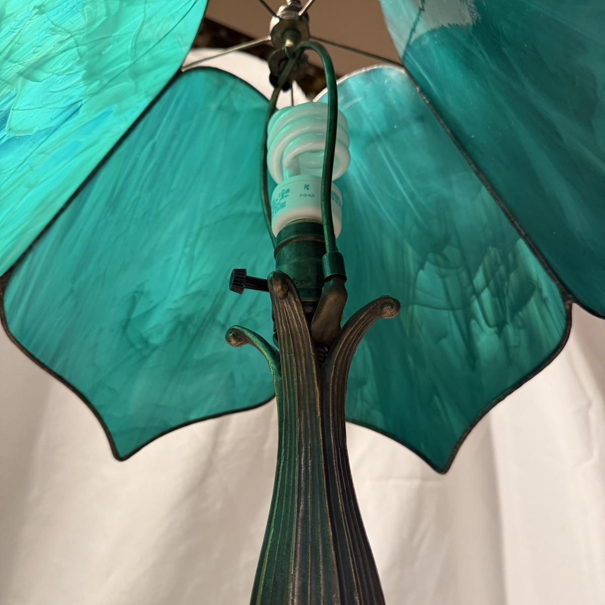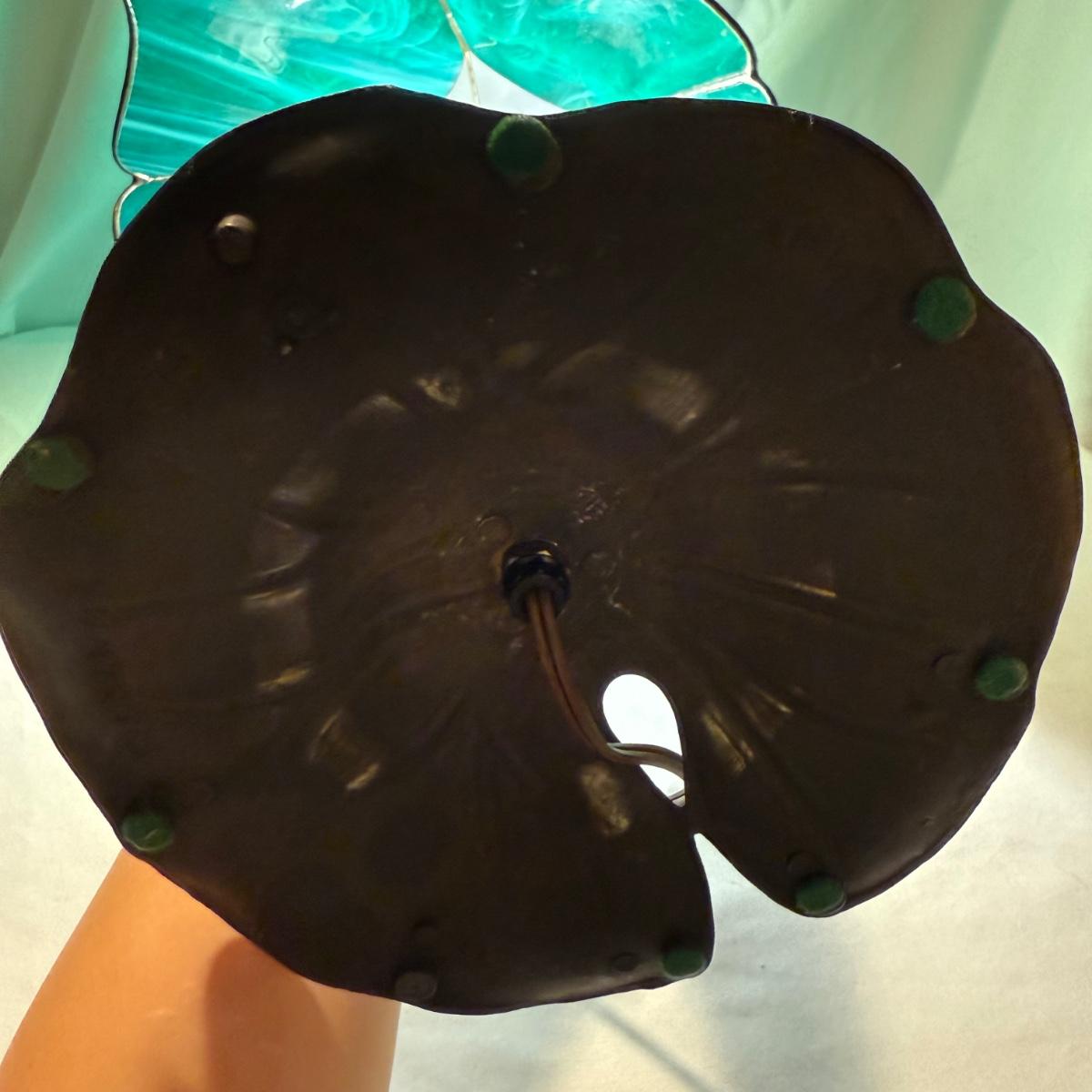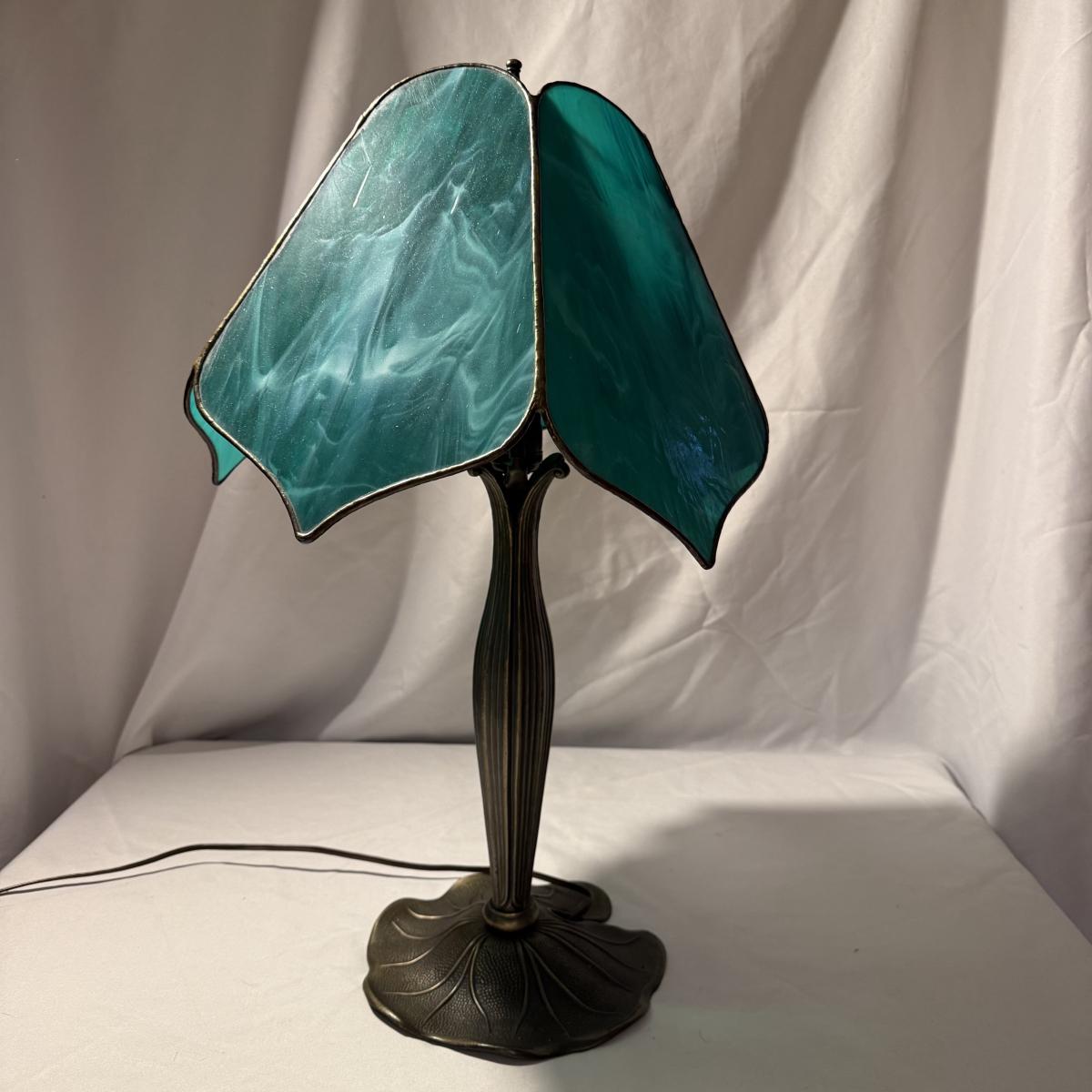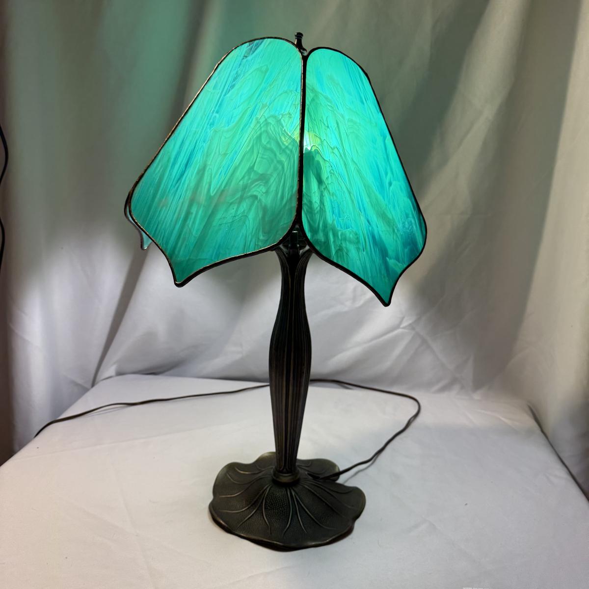 This lot contains one stunning lamp. What appears to be brass base lotus lamp with a deep green stained-glass shade. This lamp is a one-way switch and measures 9”D at the base 23.5”H. There are multiple cracks in one of the glass panes. Shipping available.