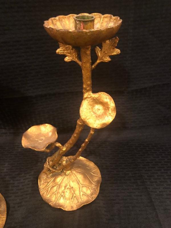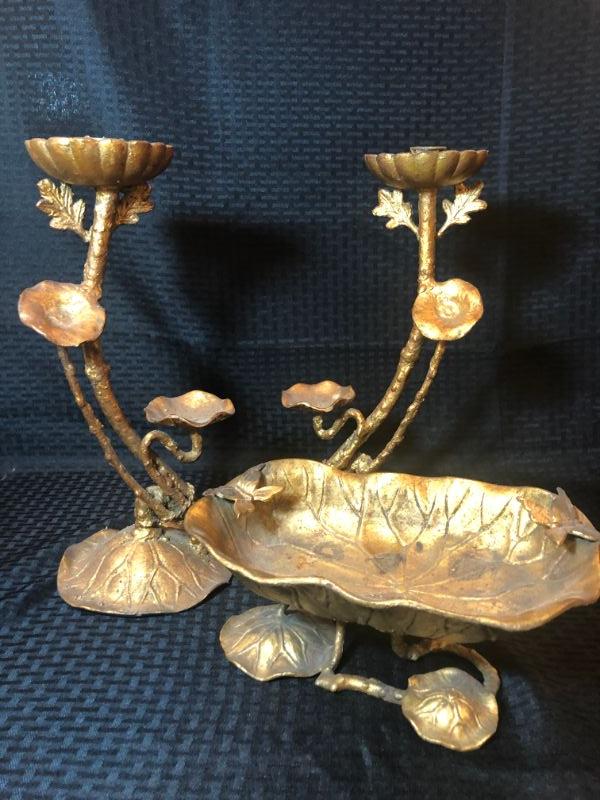 Cast iron gold gilt lotus leaf centerpiece bowl and candle sticks. Hollywood regency style.