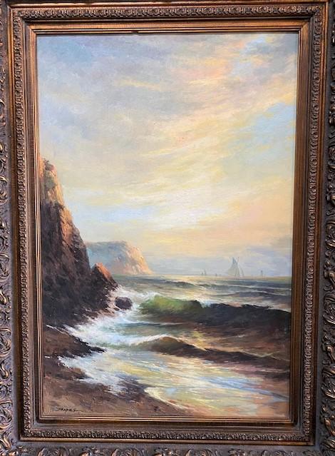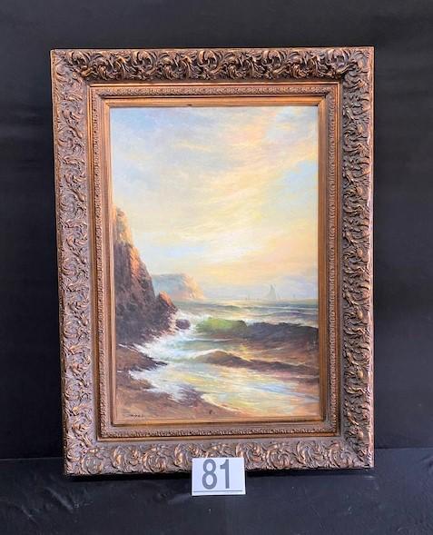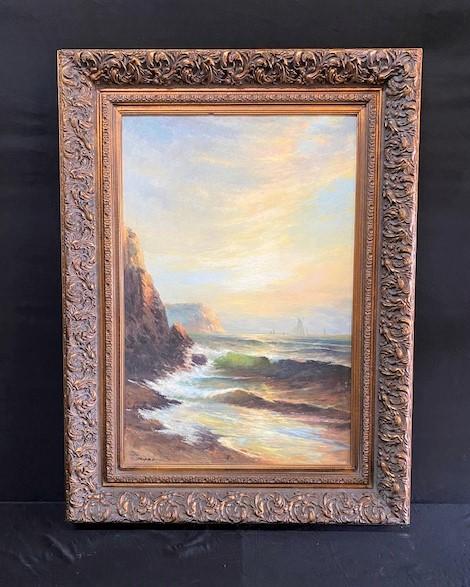LOT#V81: Signed Rocky Coastal Scene with Sailboats
