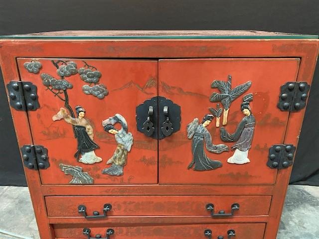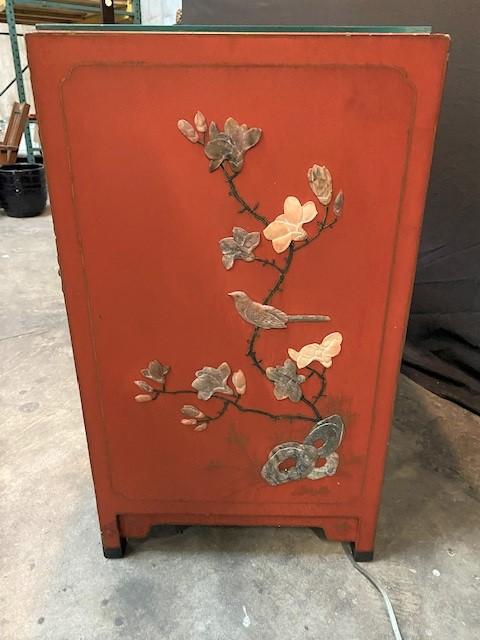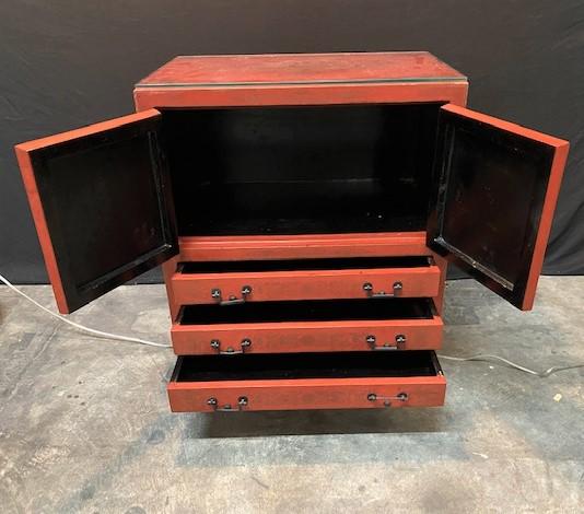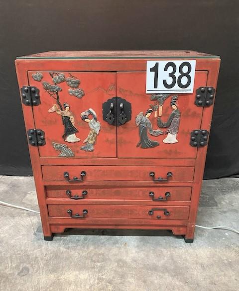 3 drawers, bifold doors. Appears to be jade & mother of pearl accents. Estimated weight of lot: 30lbs. Measurement: 28"H x 24W x 16 1/2"D